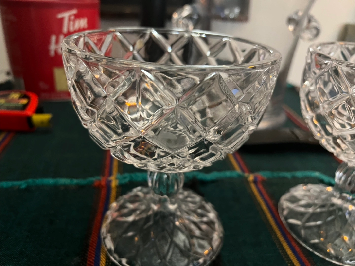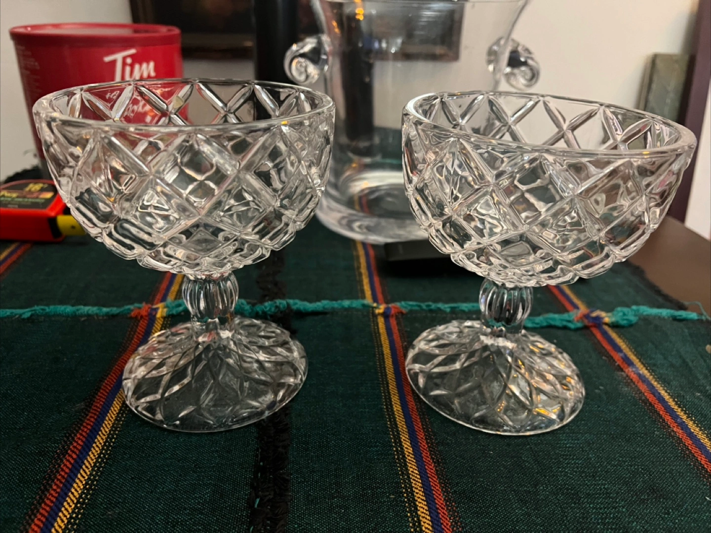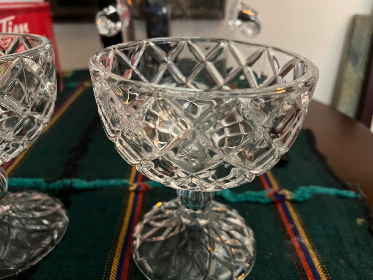 Selling a vintage set of two beautiful cut crystal dessert or candy They feature an elegant diamond-cut pattern and a sturdy base. Perfect for adding a touch of sophistication to your table setting!