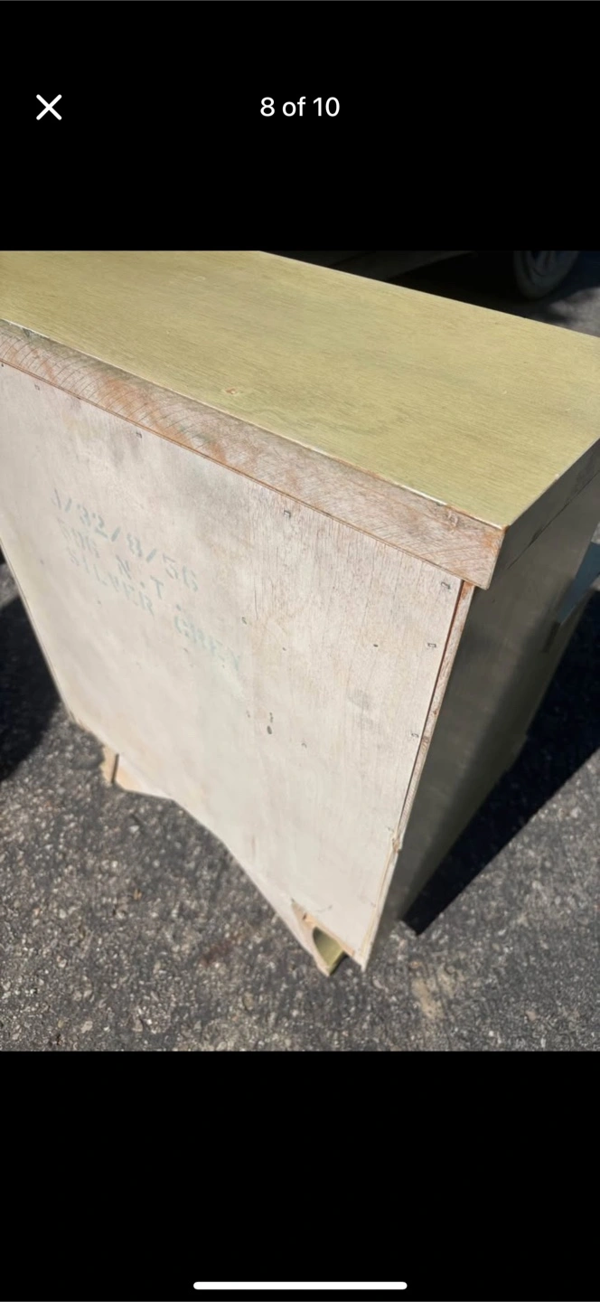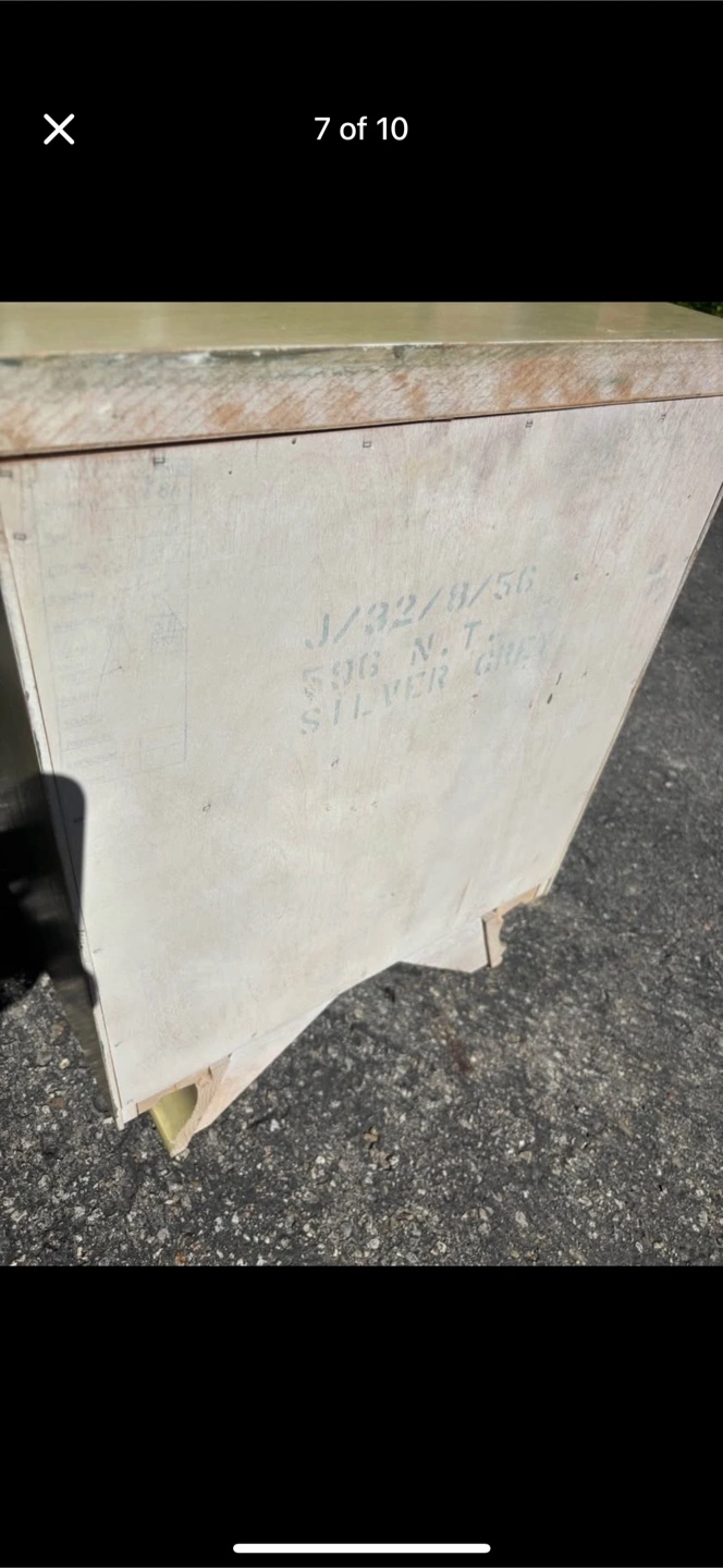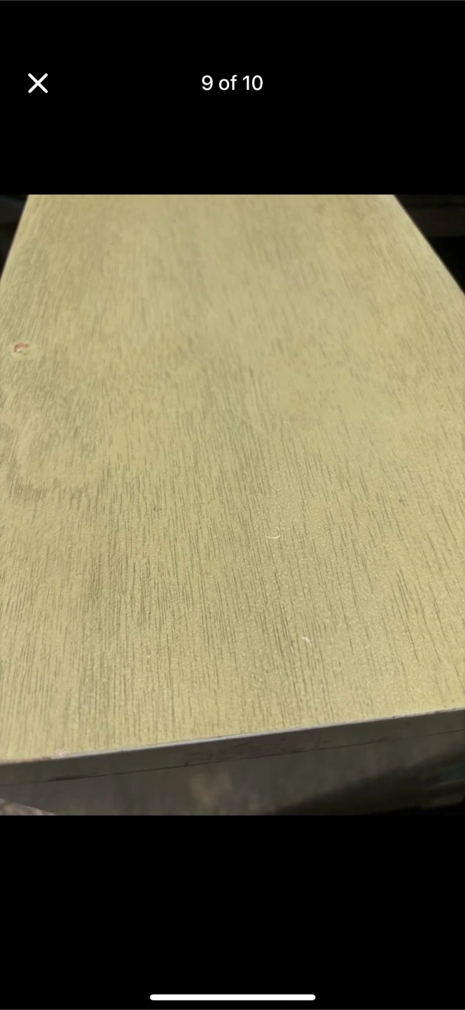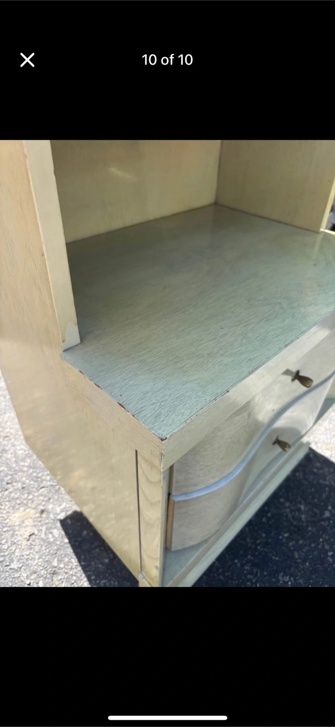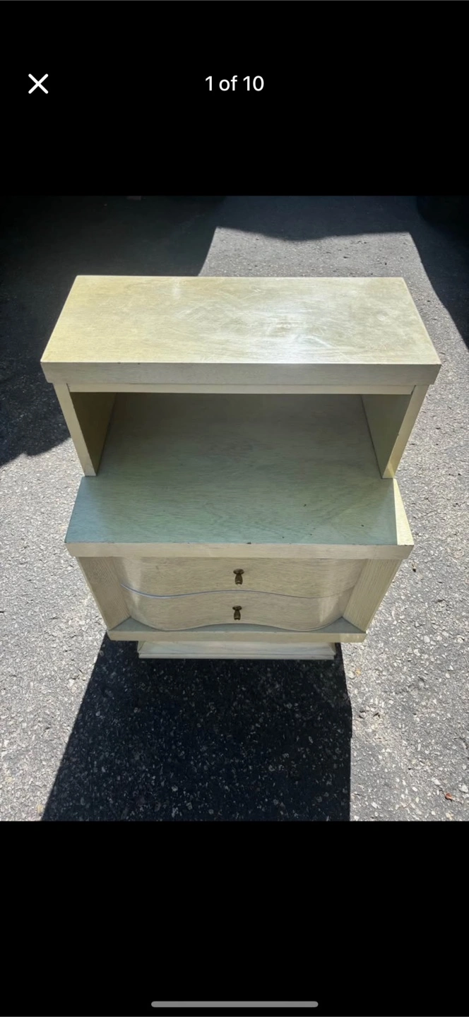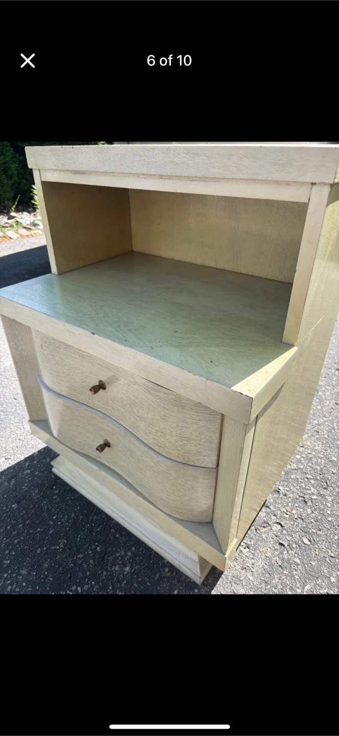 Here's a cute vintage nightstand with two drawers! It has a unique wavy design on the drawer fronts. Perfect for adding a touch of retro charm to your bedroom or living space.
