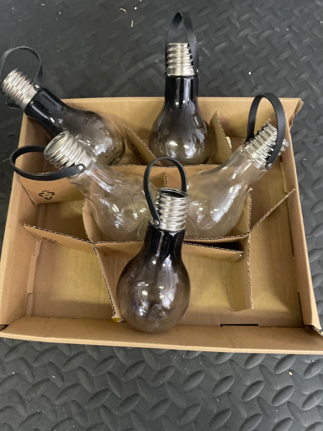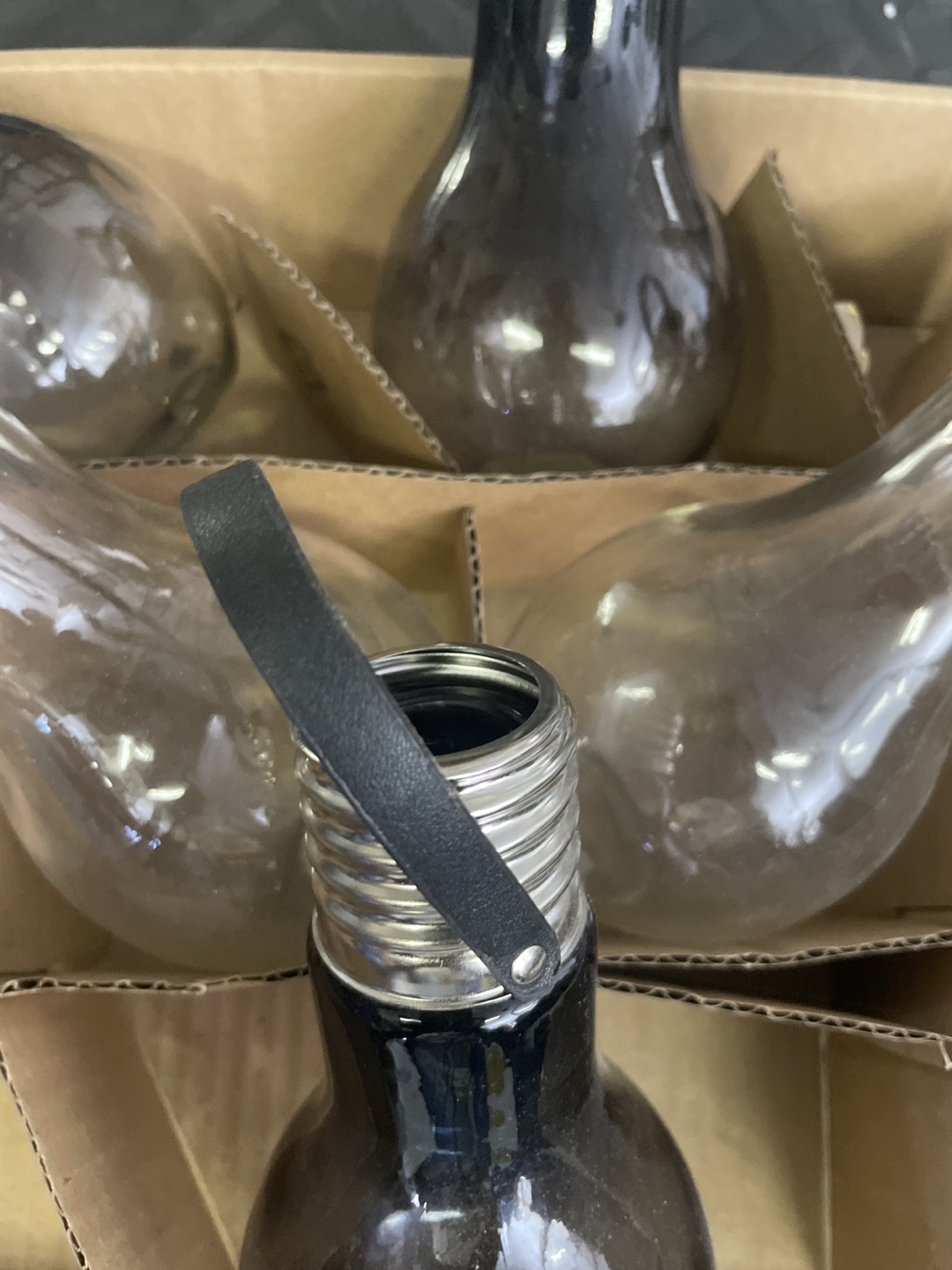 Selling a set of bulb-shaped glass bottles, complete with leather handles. They come in their original box, making them easy to transport or store. These unique bottles are perfect for adding a touch of whimsy to your decor or for use as decorative containers