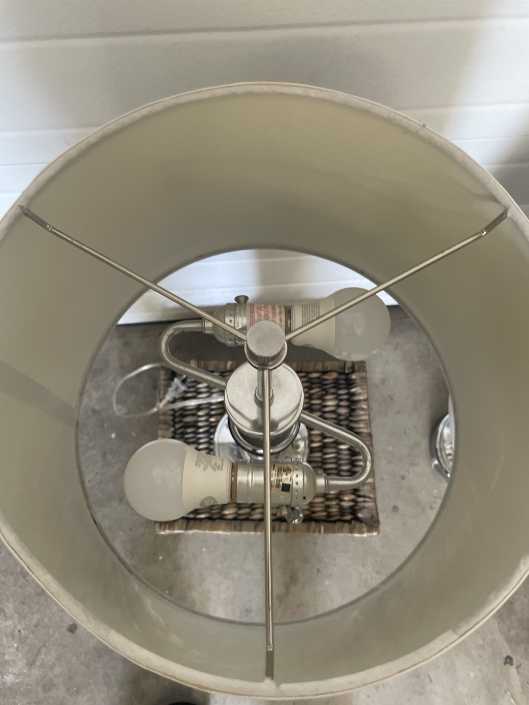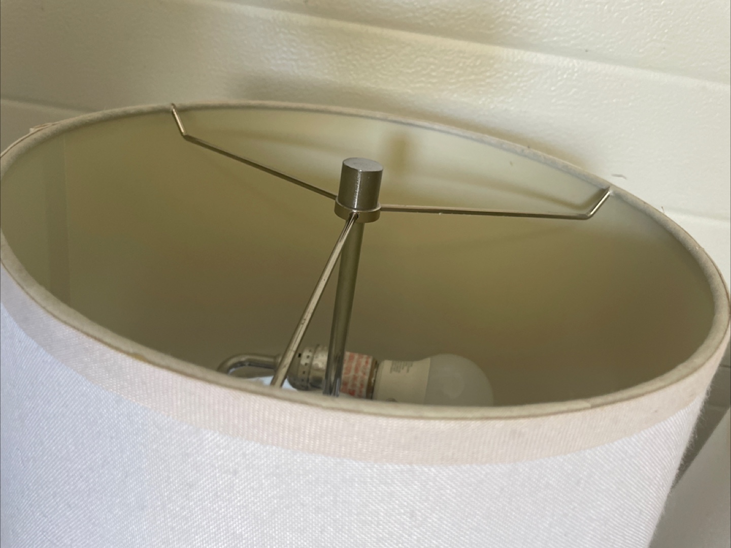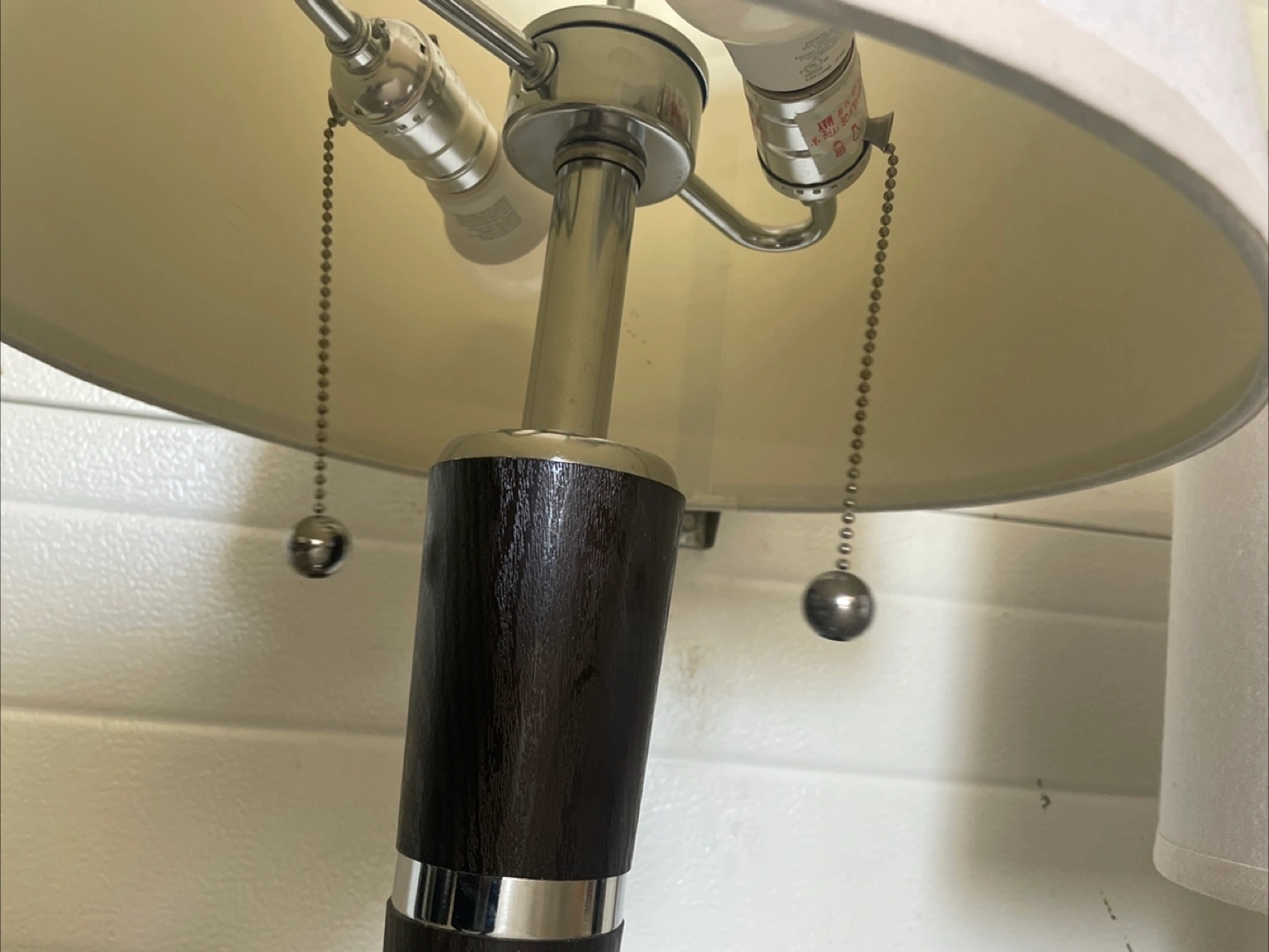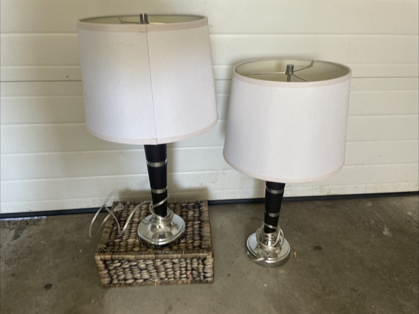 Selling a set of two table lamps. They feature a white shade, a dark brown wood-look centre, and a silver base. Perfect for adding a touch of elegance to any room!