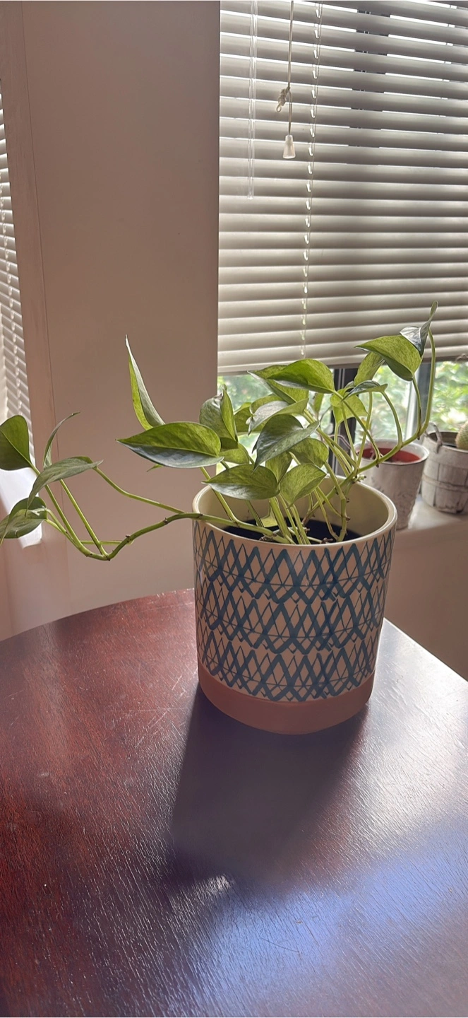 A lovely golden pothos plant in a decorative pot! It's perfect for adding a touch of greenery to your home or office. The pot has a geometric pattern in blue and white, and it's in great condition :)