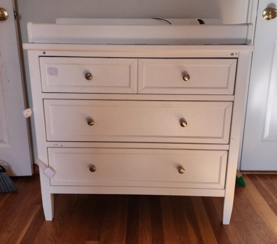 I'm selling a changing table dresser. It features a classic design with 3 drawers, providing ample storage space for baby essentials. The changing table top is spacious and secure, making diaper changes a breeze. This versatile piece can be used as a regular dresser once your little one outgrows the changing table, ensuring long-term use and value. slight water deformation in the middle drawer. Currently has child locks on but they can b removed prior to pickup upon request.