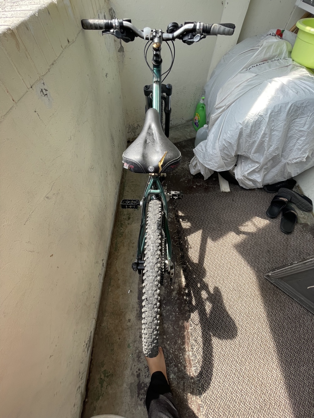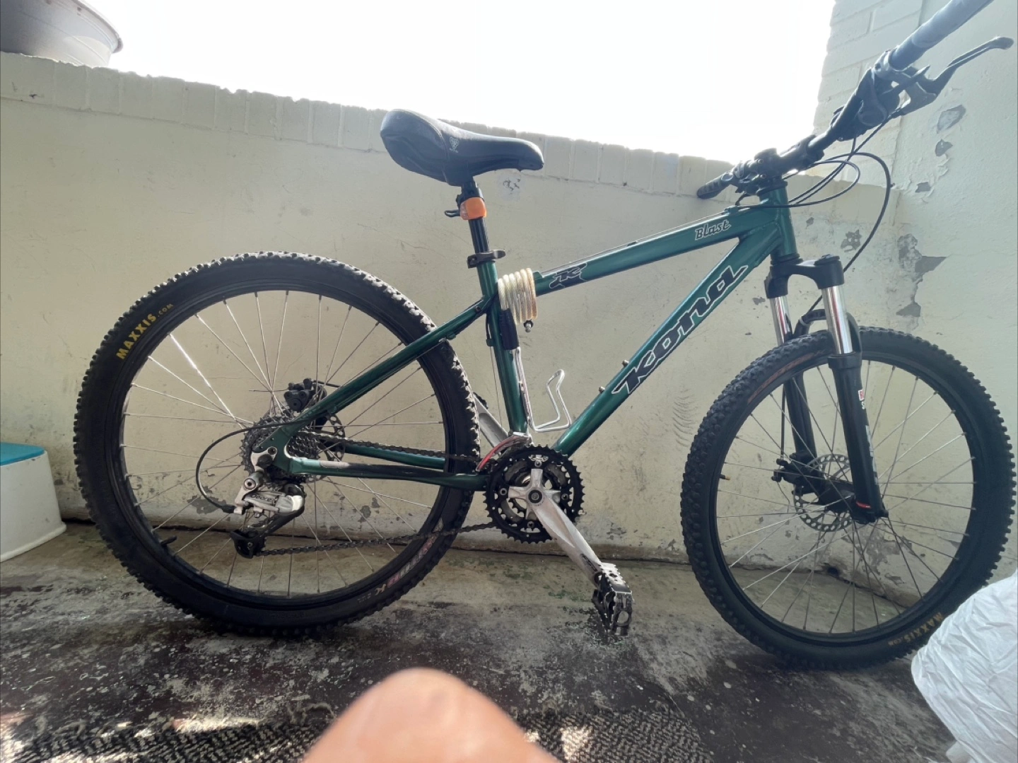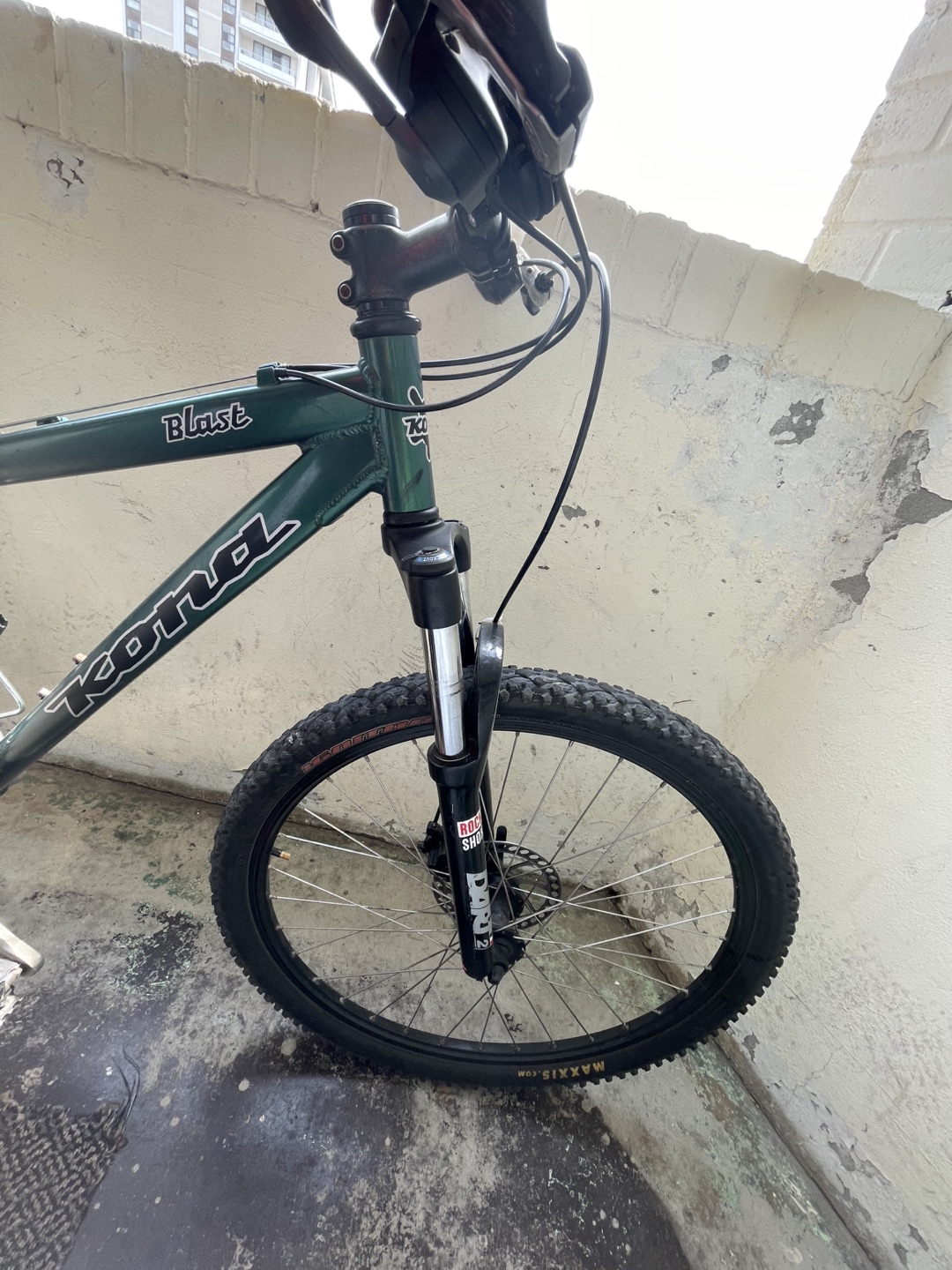 Selling a Kona Blast mountain bike. It's green and ready for some trails! The tires are Maxxis. A great bike for getting around town or hitting some local trails every thing works the breaks only needs some Wd-40 codes whit lock and lights