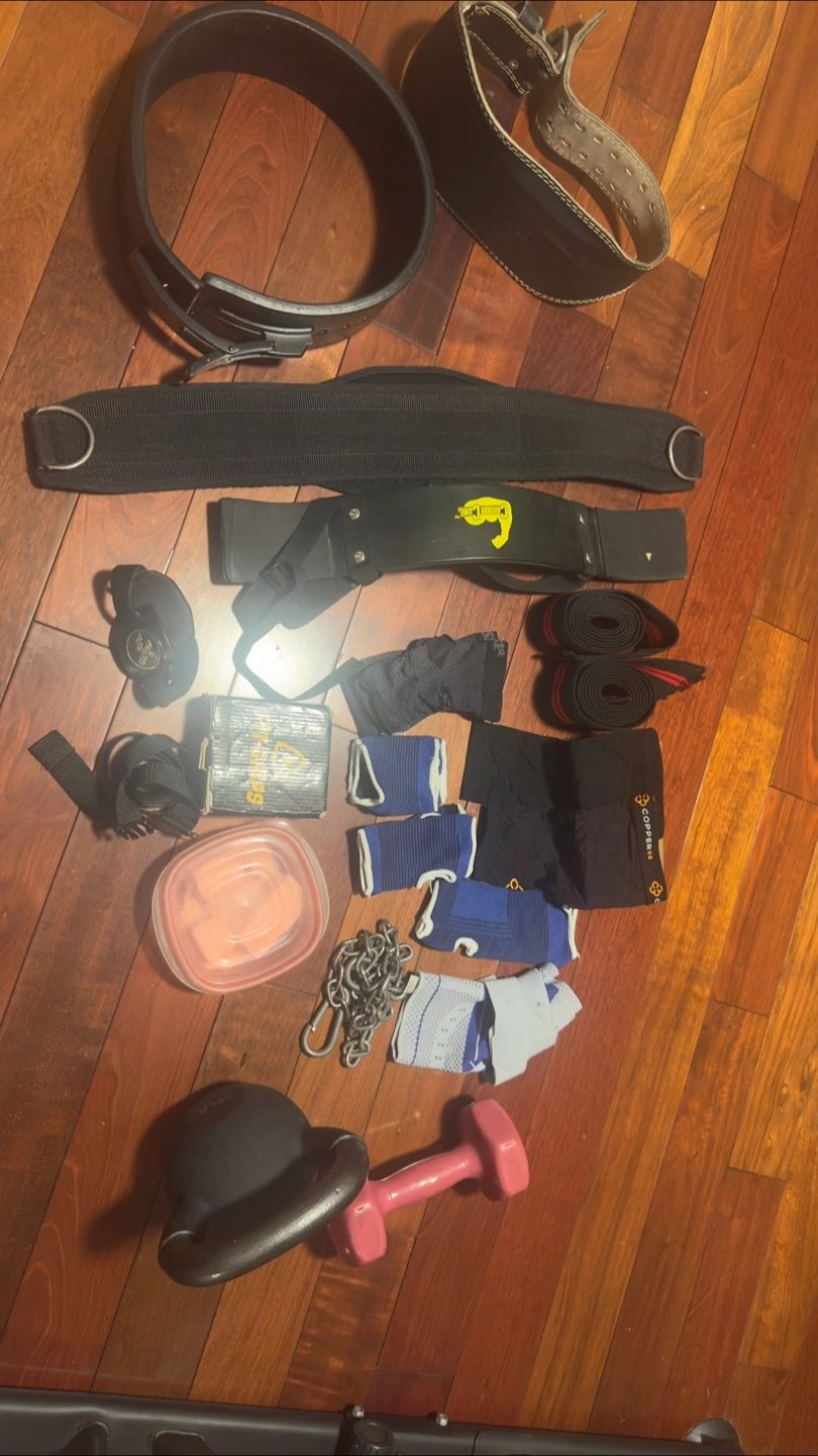 One of the weightlifting belts is a like new condition Rogue retailing for $240. Selling a Rogue black leather 13mm - 4" lever belt in size large.