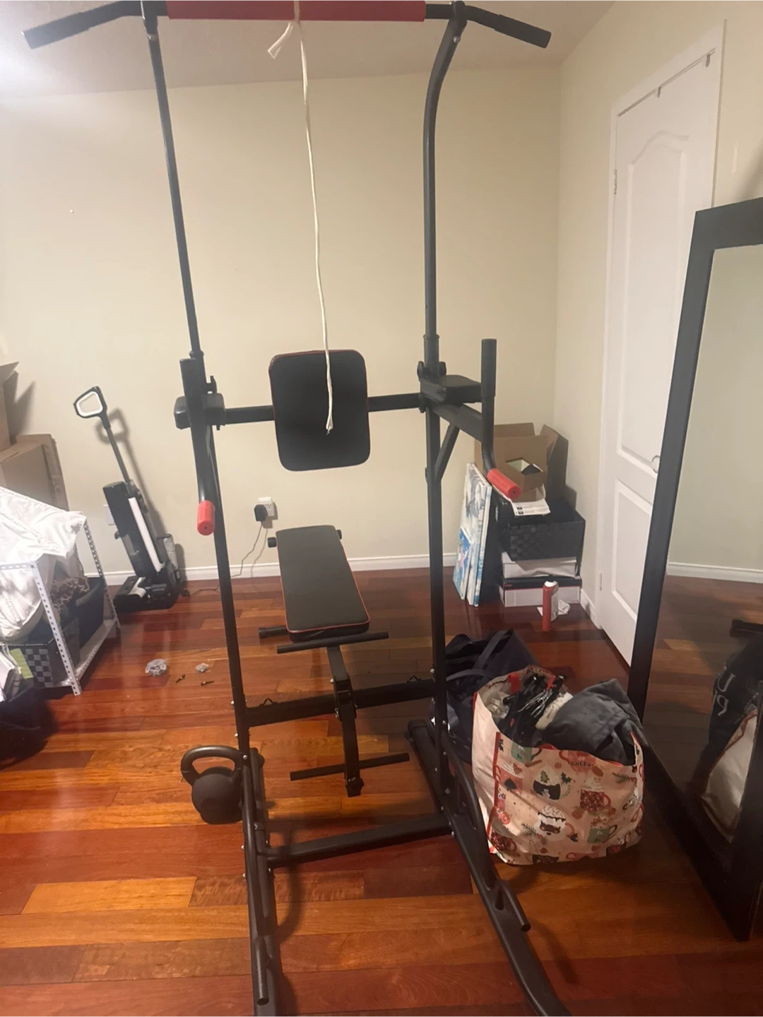 Power tower workout dip station in great condition! Perfect for home workouts and building strength. Includes various accessories like weightlifting belts, wrist wraps, and other training gear. Get everything you need for a full-body workout in one package