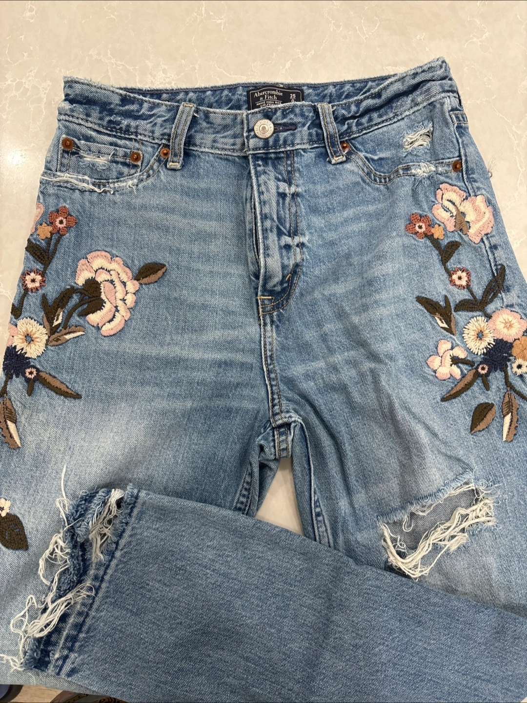 Cute Abercrombie & Fitch jeans with beautiful floral embroidery! They are a size 25 and feature a stylish distressed look with rips. Perfect for adding a touch of flair to your wardrobe