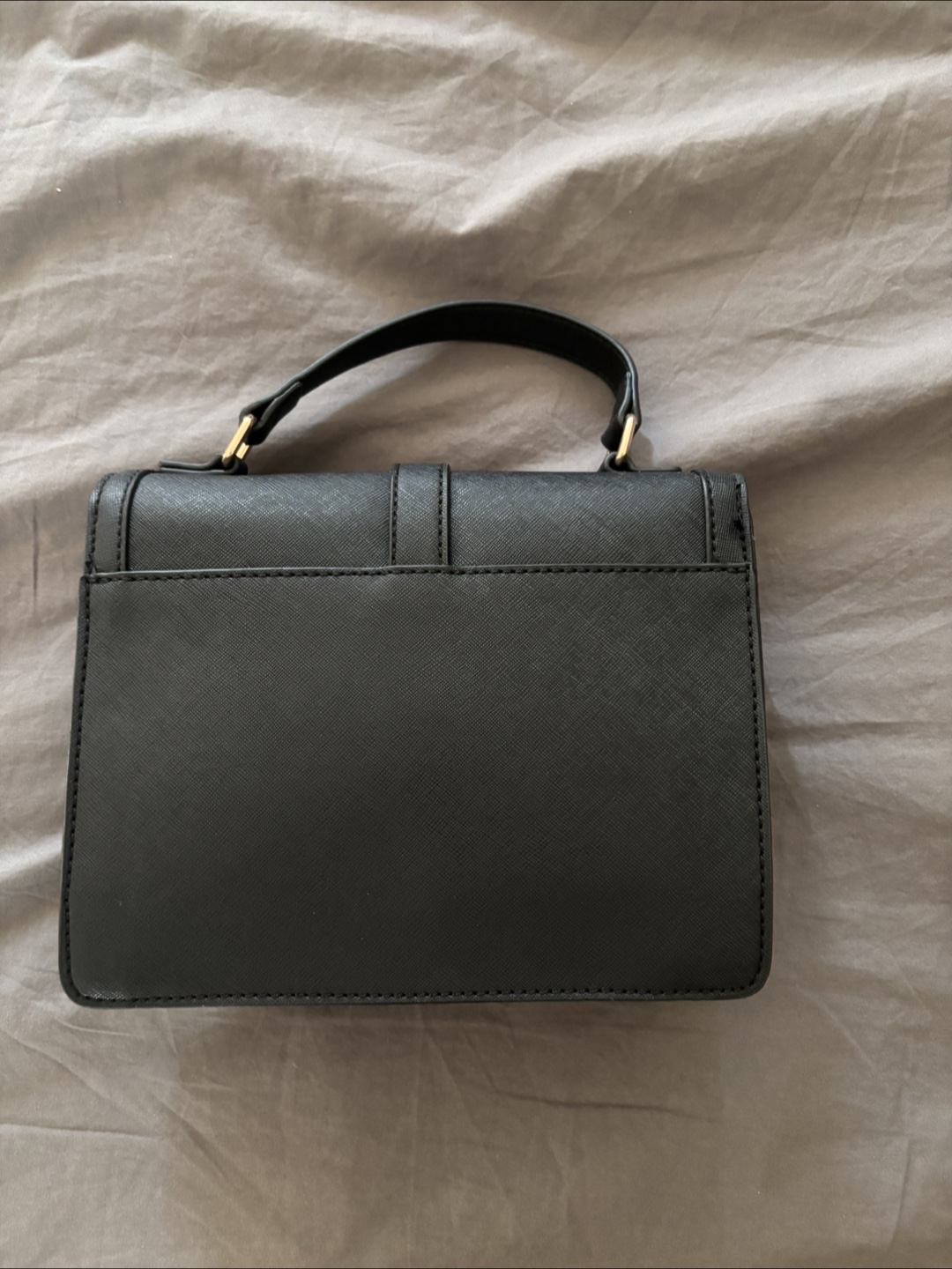 This is a cute Guess Los Angeles satchel handbag in black. It's a stylish and practical accessory to complete your outfit. The interior has a logo pattern.