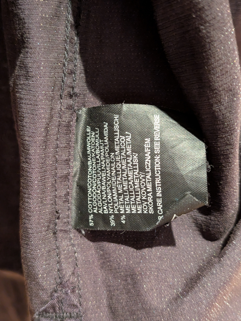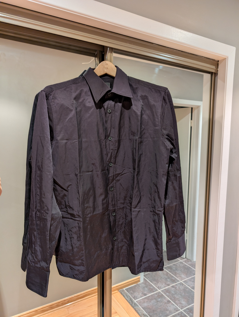 This is a MExx button-down shirt in a sleek black colour. Hardly worn. It has metal shavings to give it a metallic sheen. The size is M (Medium). Slim fit. The material composition is: