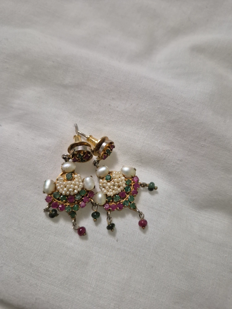 These are a pair of beautifully detailed earrings featuring pearls and gemstones. They have a unique design with small pearls surrounding a central stone, accented by smaller gemstones in green and red. The earrings have a post-style closure.