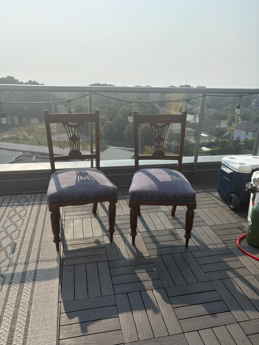 Selling a set of two antique wooden chairs. They feature a classic design with a patterned seat. Perfect for adding a touch of vintage charm to your home!