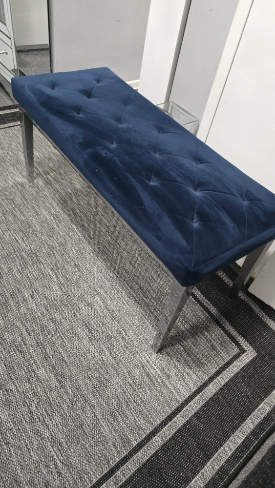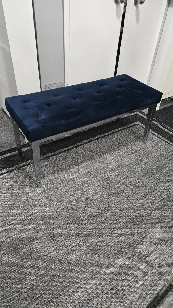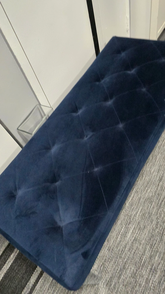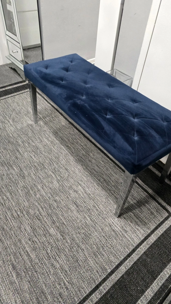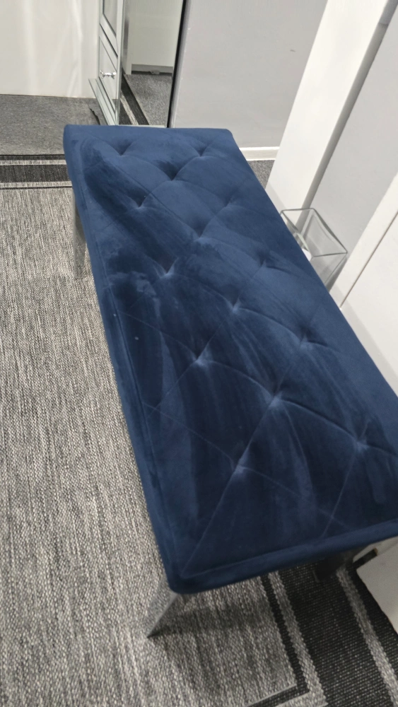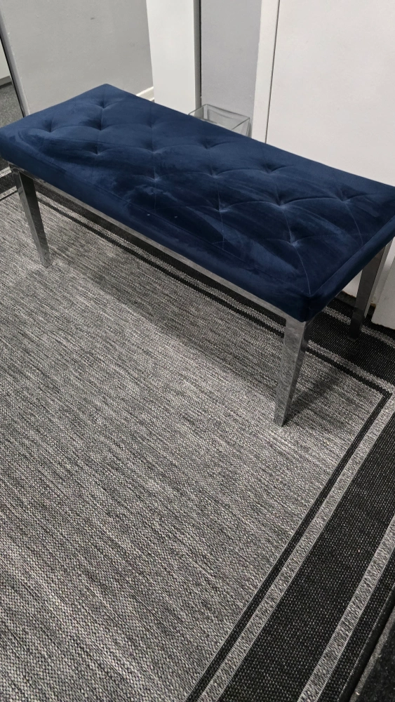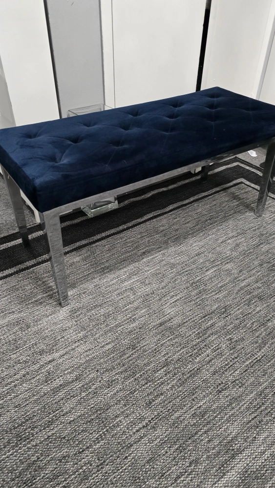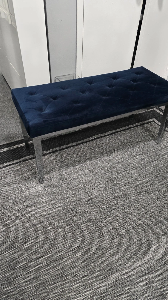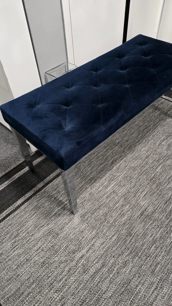 35Selling a lovely navy blue velvet tufted bench! It's in great condition and would look great in any room. The legs are a shiny silver colour. It's quite sturdy and comfortable to sit on