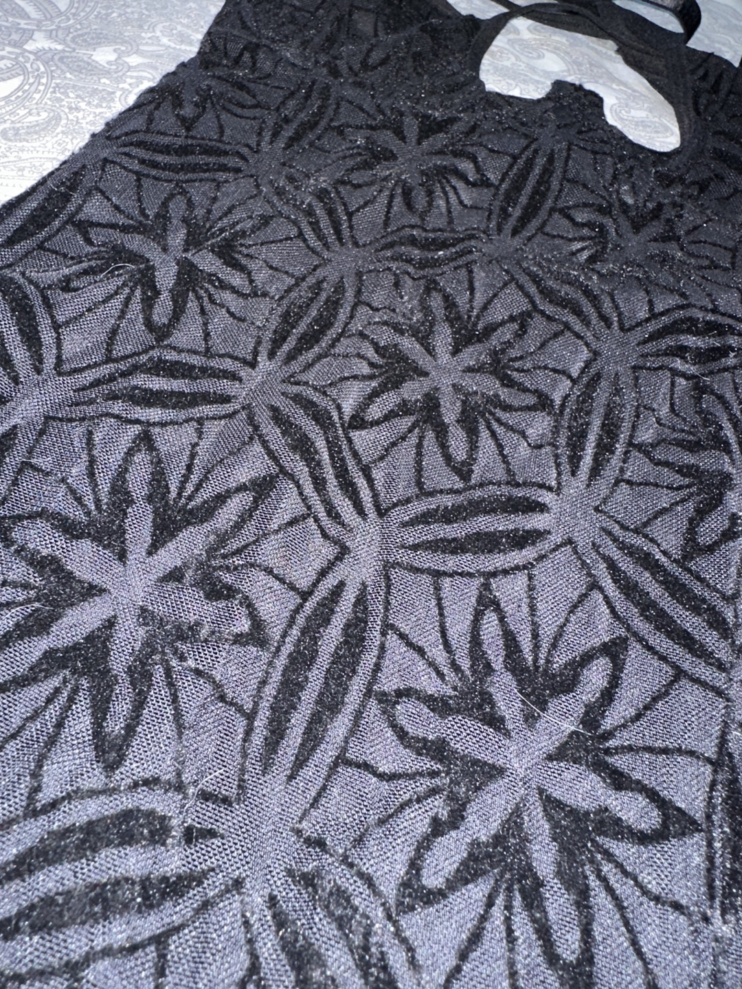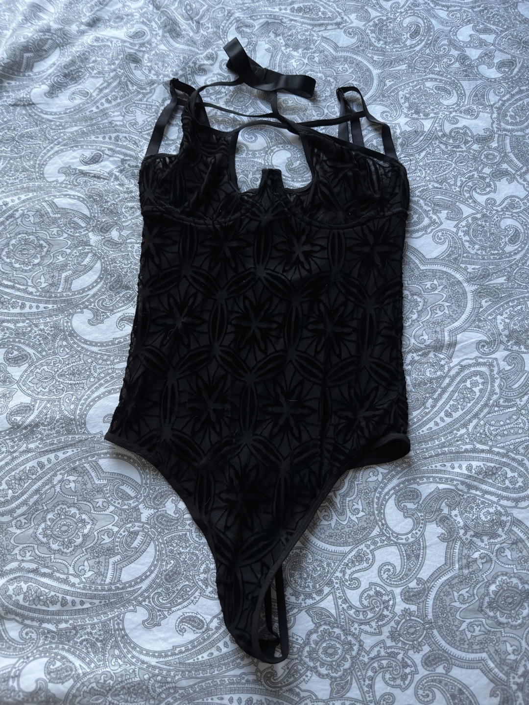 A stylish black bodysuit with a unique floral pattern. Perfect for a night out or a special occasion. The intricate design adds a touch of elegance to this piece