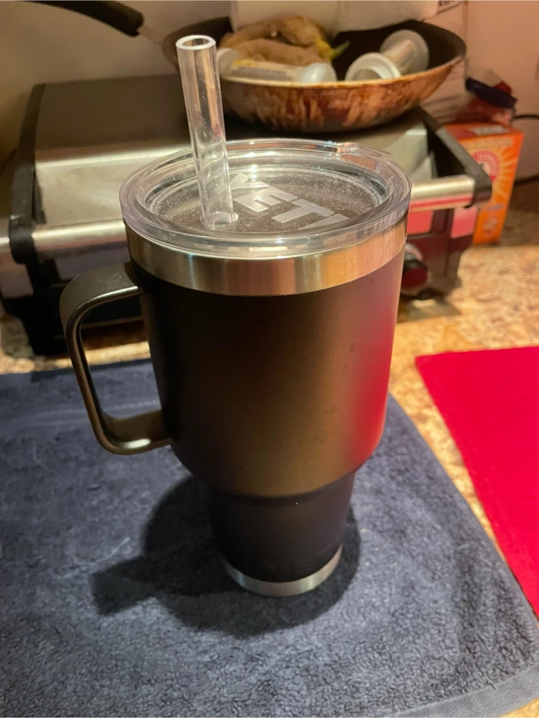 Selling a YETI tumbler in black! It comes with a handle and straw, perfect for keeping your drinks cold (or hot!) on the go. There are some signs of use, but overall it's in good condition and ready for a new home