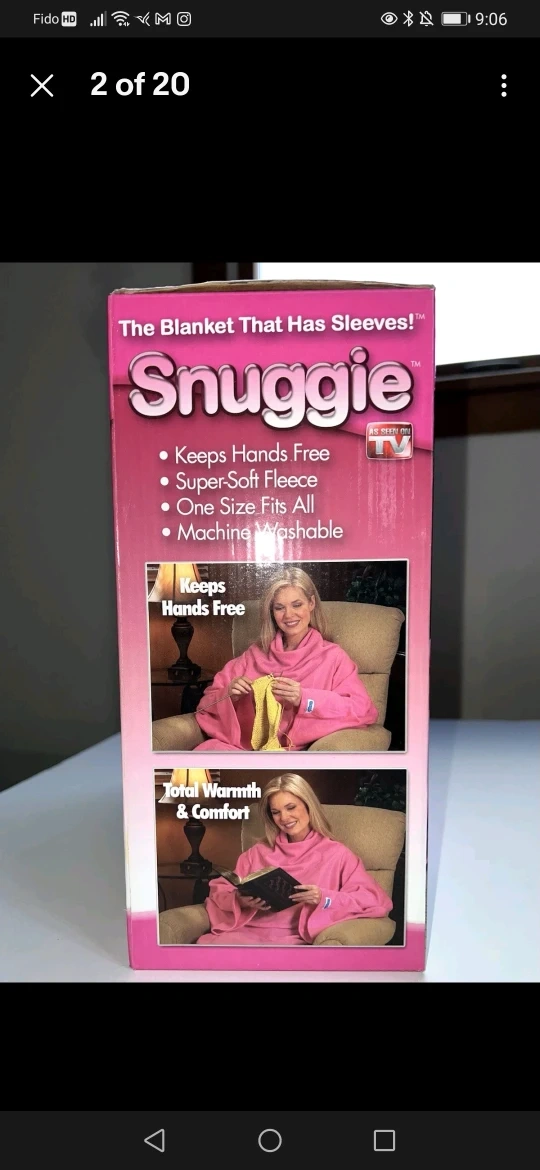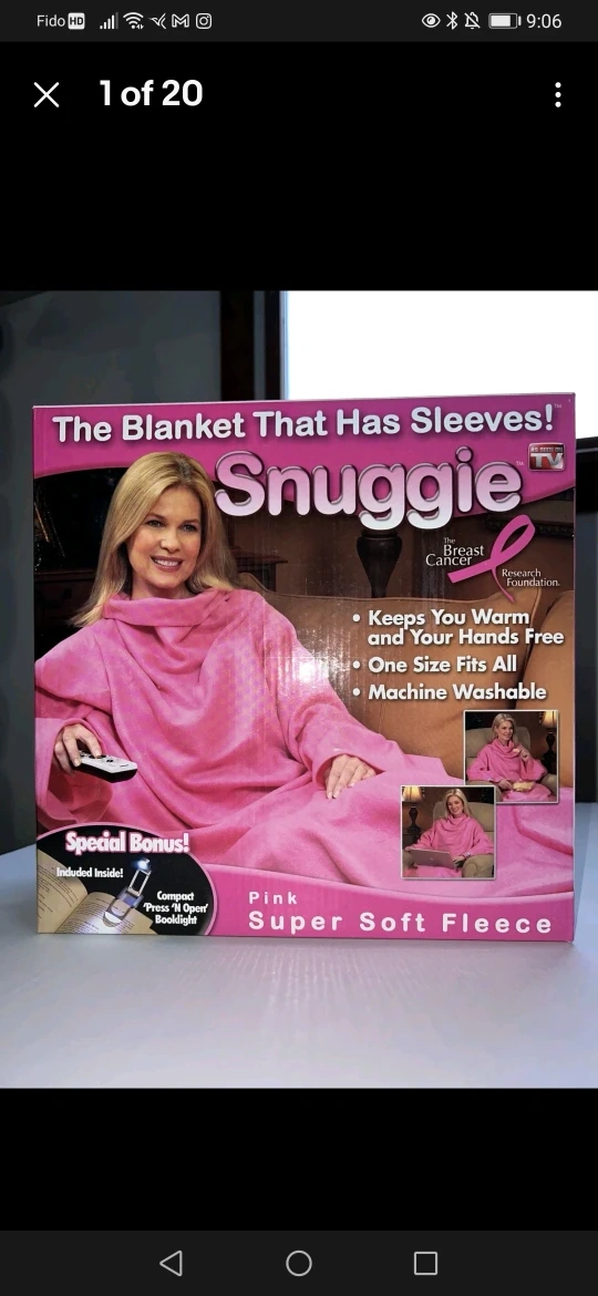 Snuggie, the blanket that has sleeves, is here! It's pink, super soft fleece, and one size fits all. It keeps your hands free and is machine washable. The box is included, and it even comes with a special bonus compact press 'n' open booklight inside