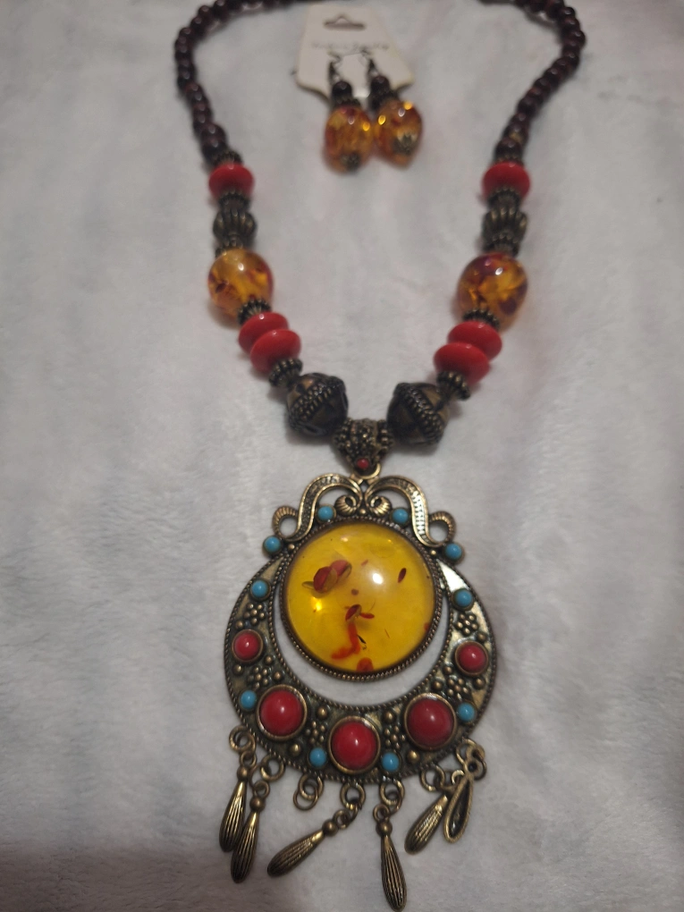 Beautiful necklace and earrings set. The necklace features a unique pendant, , complemented by matching earrings. Perfect for adding a touch of elegance to any outfit