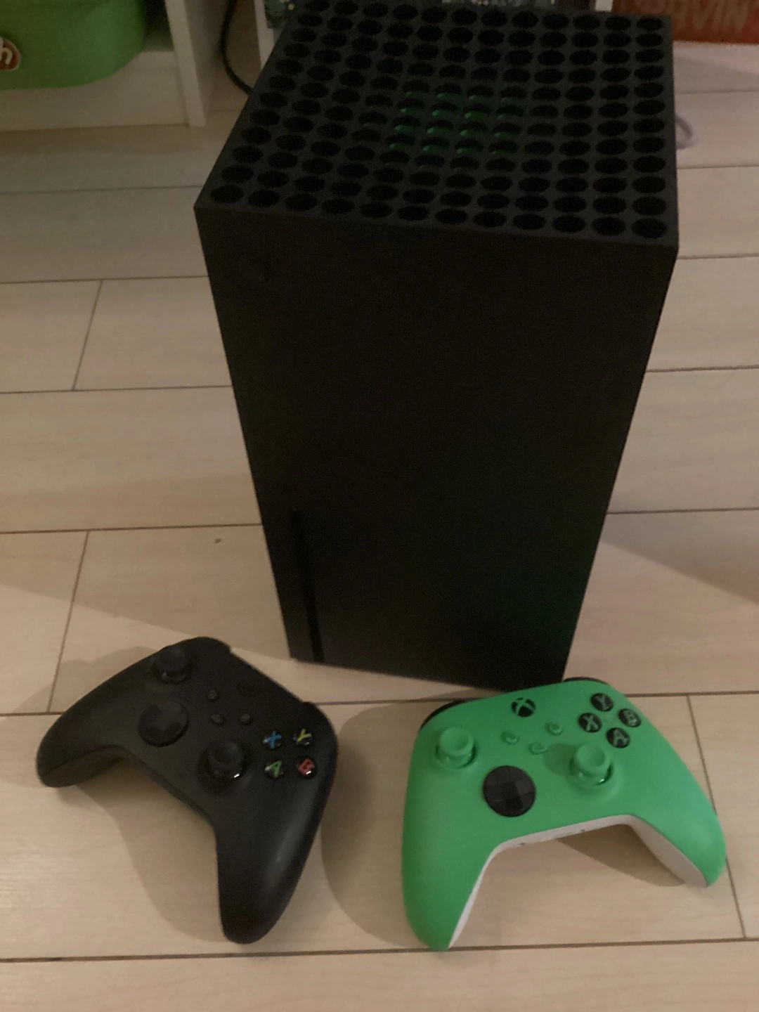 Selling my Xbox Series X console out of box, which comes with two controllers! One is the standard black and the other is a vibrant green. Both controllers are in great working condition.Happy gaming!