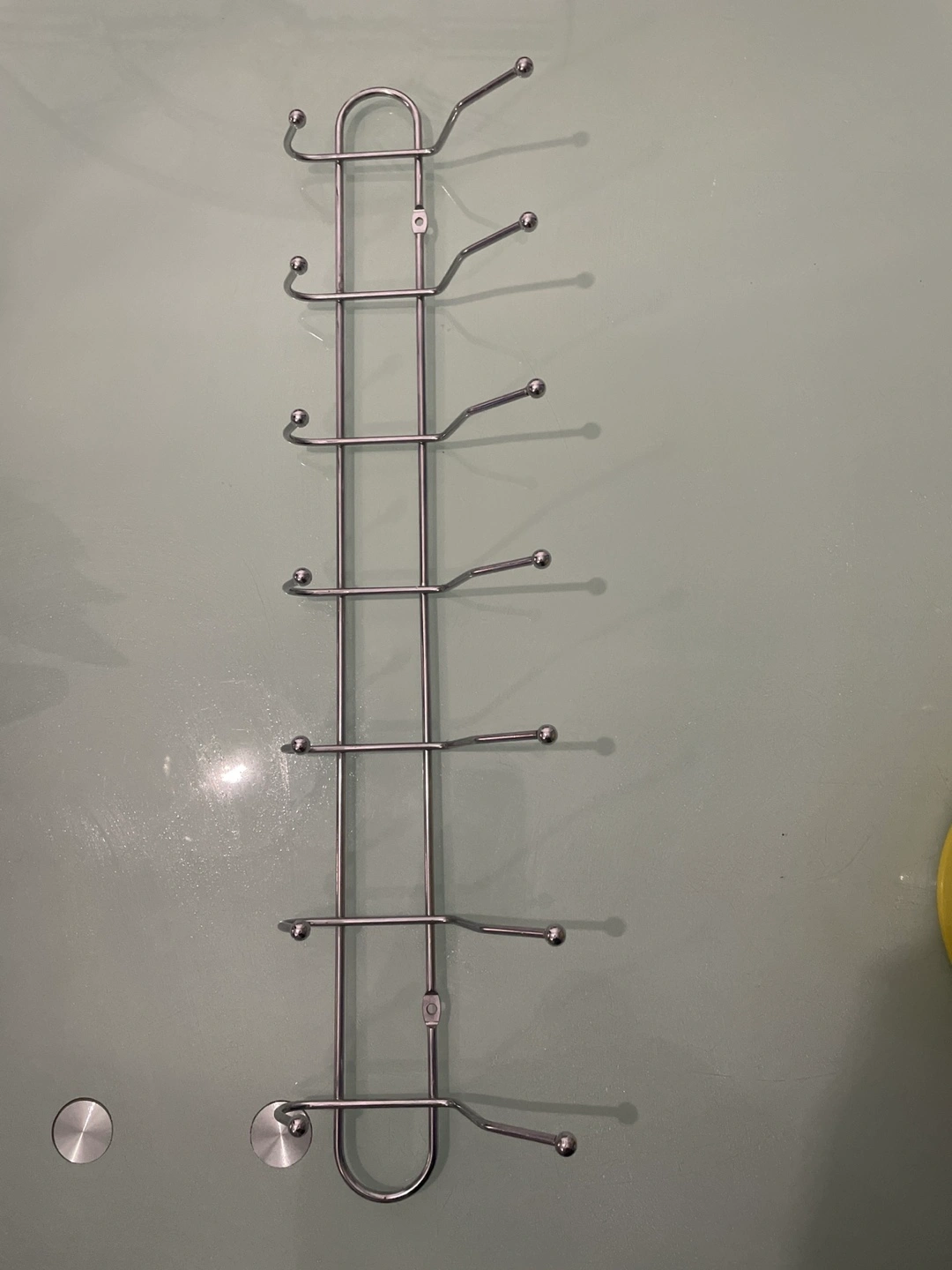 Here's a handy over-the-door hook rack! Perfect for adding some extra storage to your closet or bathroom. It's made of sturdy metal and has multiple hooks for hanging coats, towels, or anything else you need to keep organized