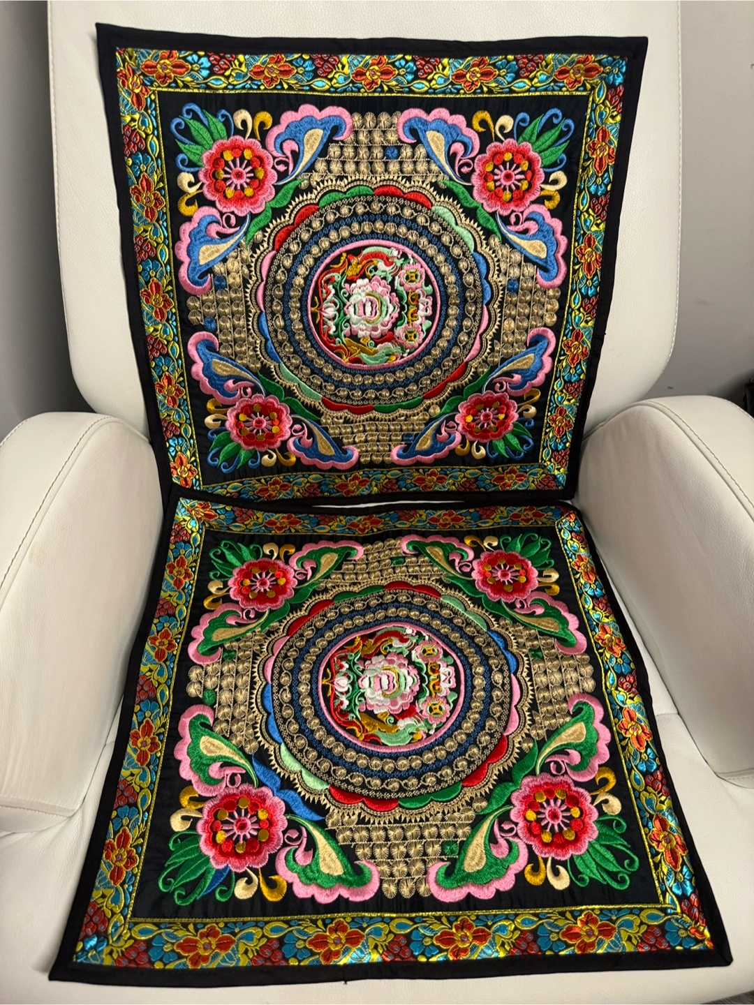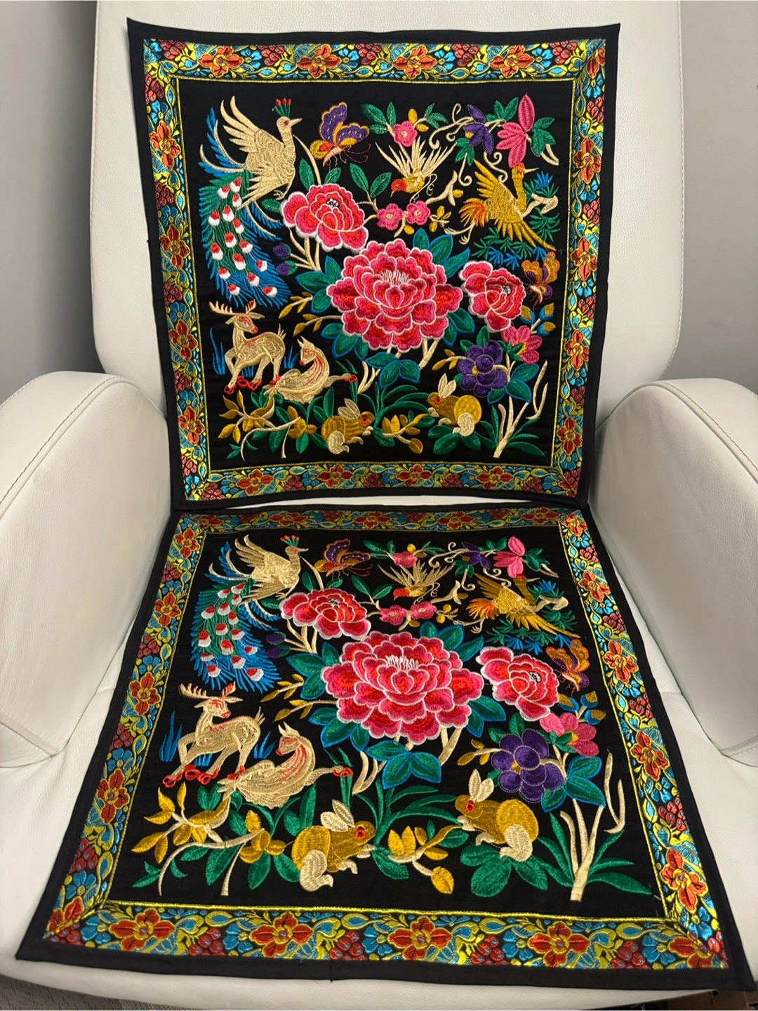 Beautiful Handmade Embroidered Pillow Covers – Bright, detailed floral and animal designs on the front, colorful woven pattern on the back. Adds a pop of color and charm to any room. Excellent condition. Approx. 18”x18”.