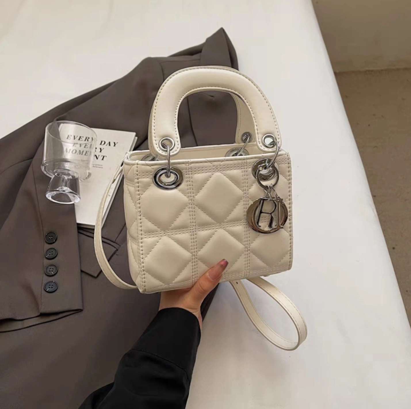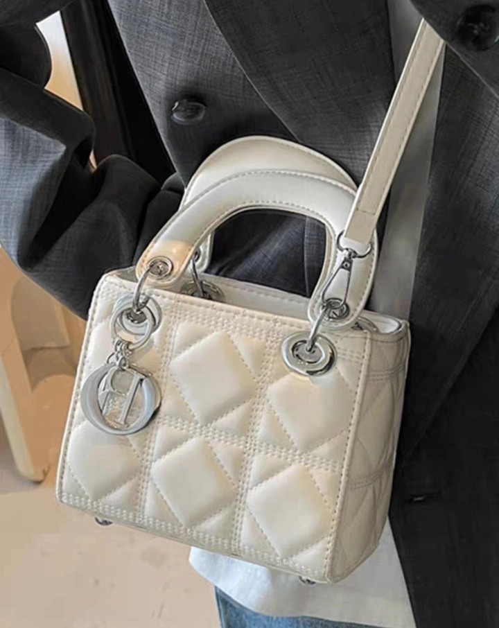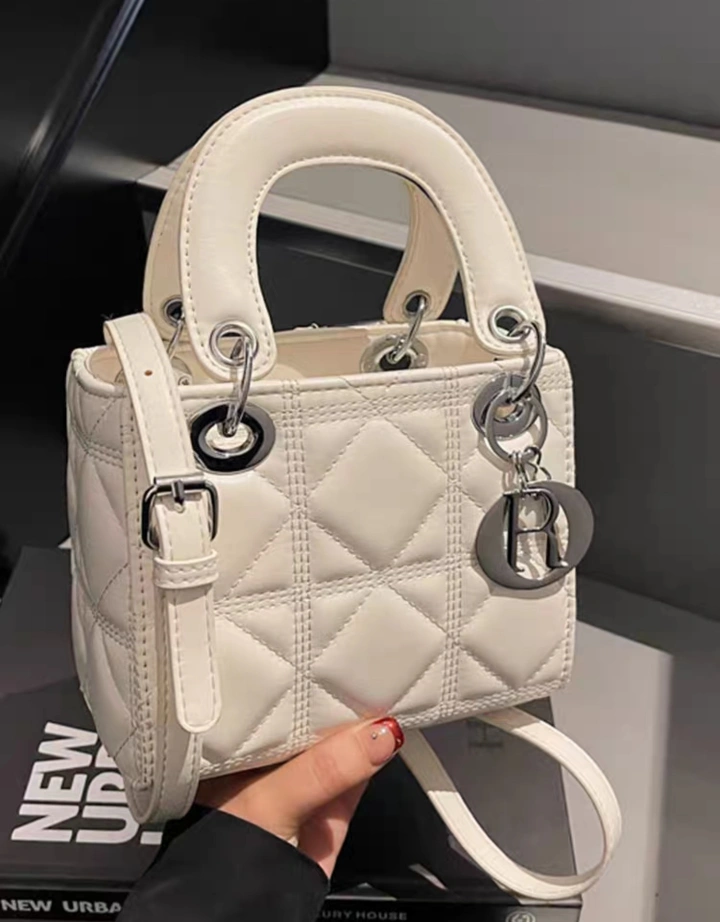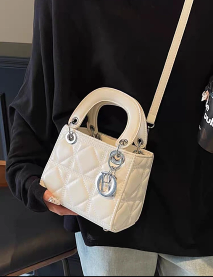 This is a cute white quilted handbag. It's perfect for everyday use and can be dressed up or down. It features a top handle and a detachable shoulder strap.