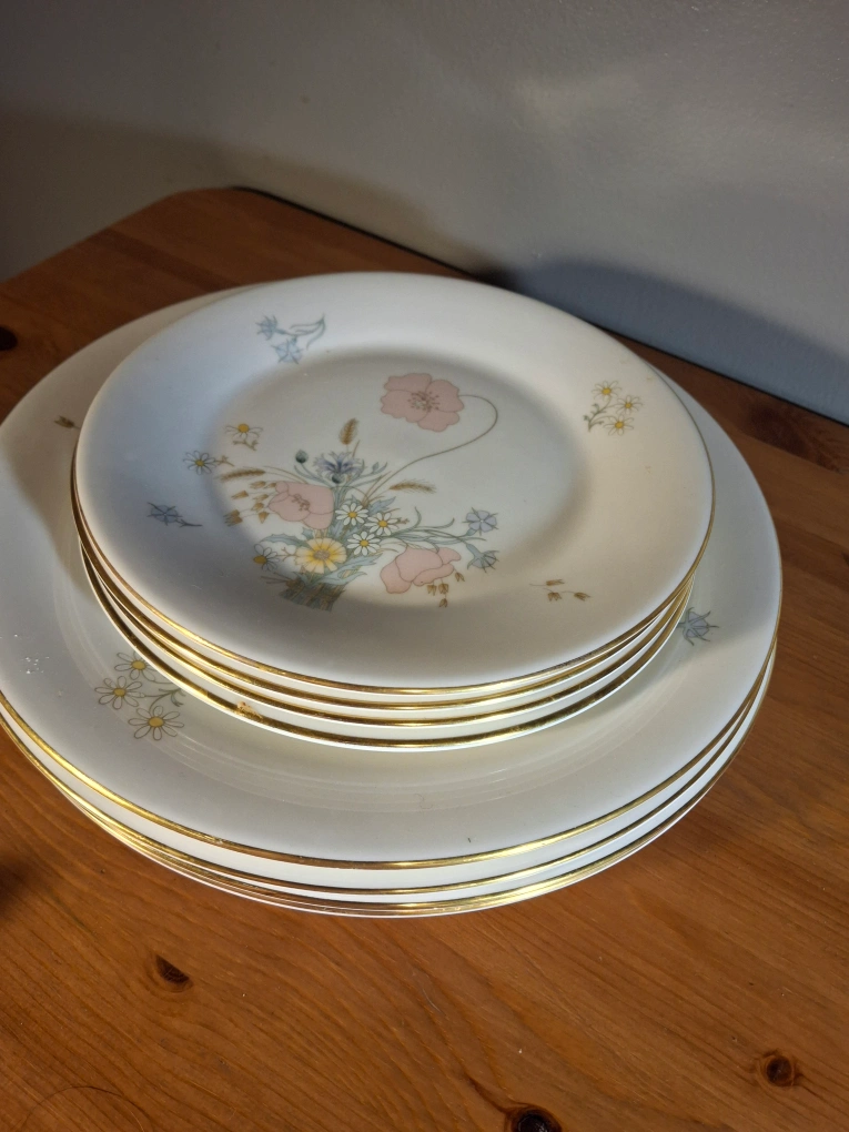 Selling a set of floral patterned plates. They have a gold trim and a cute floral design in the center. Perfect for everyday use or special occasions!
