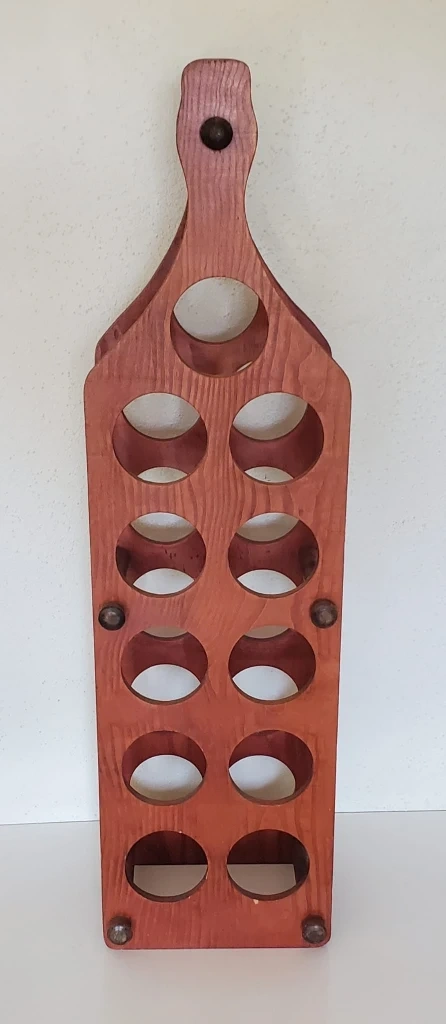 Here's a lovely wooden wine rack that can hold up to 8 bottles. It's perfect for displaying your favourite wines in a stylish and organized way. The rack is in great shape and ready to add a touch of rustic charm to your home!