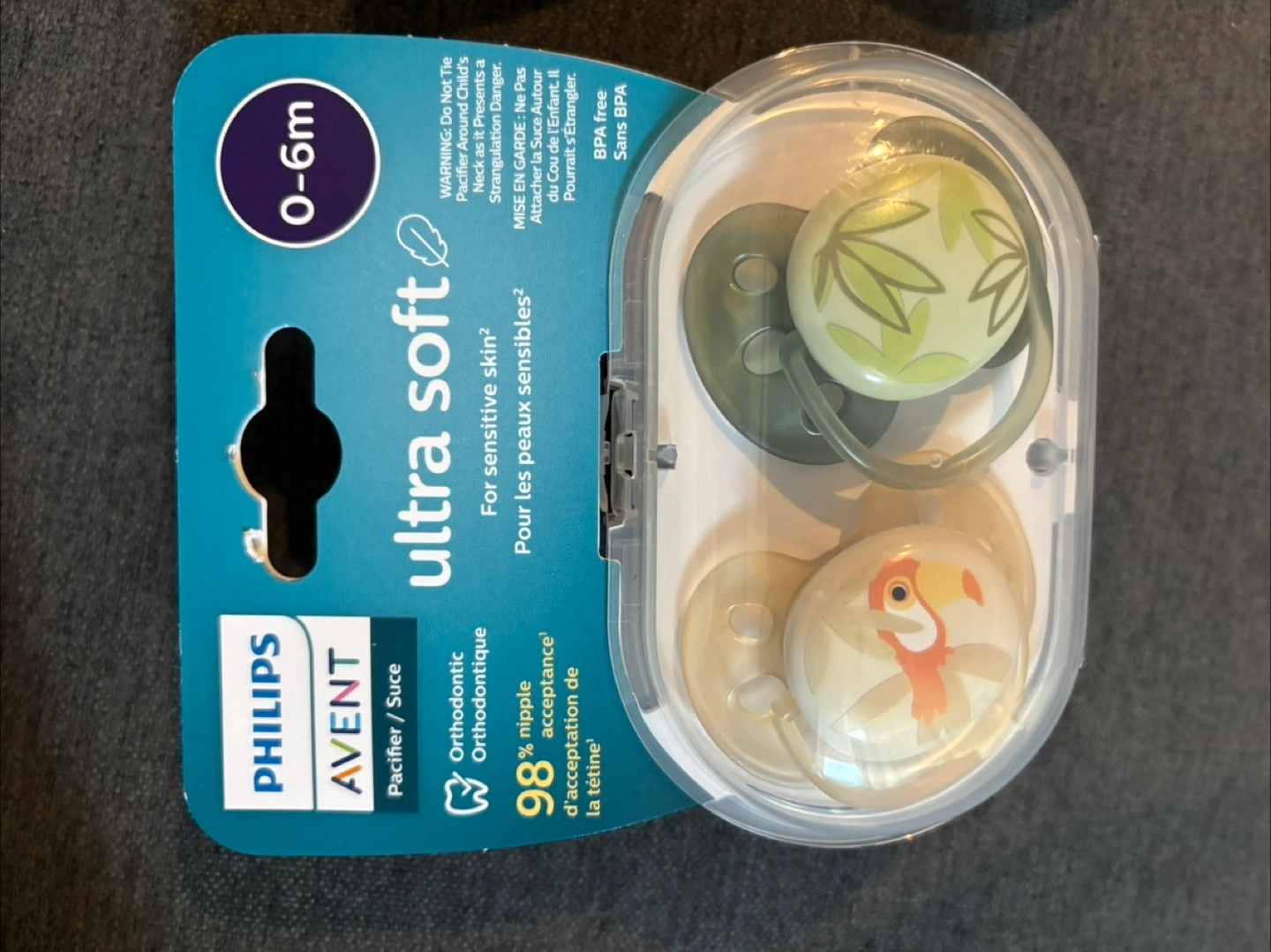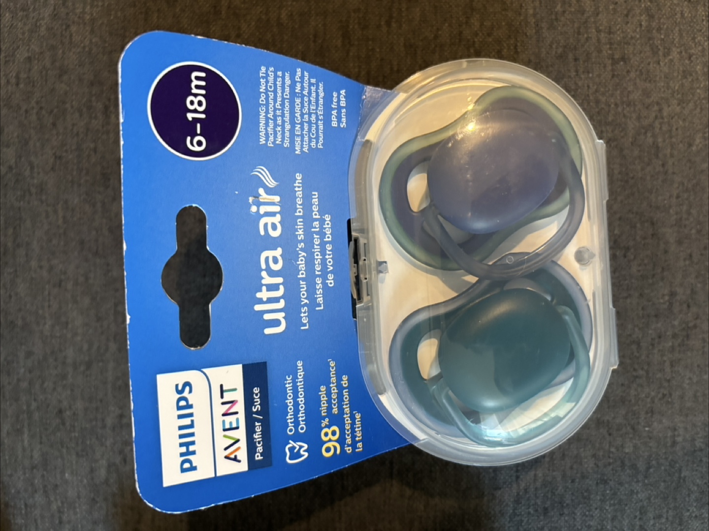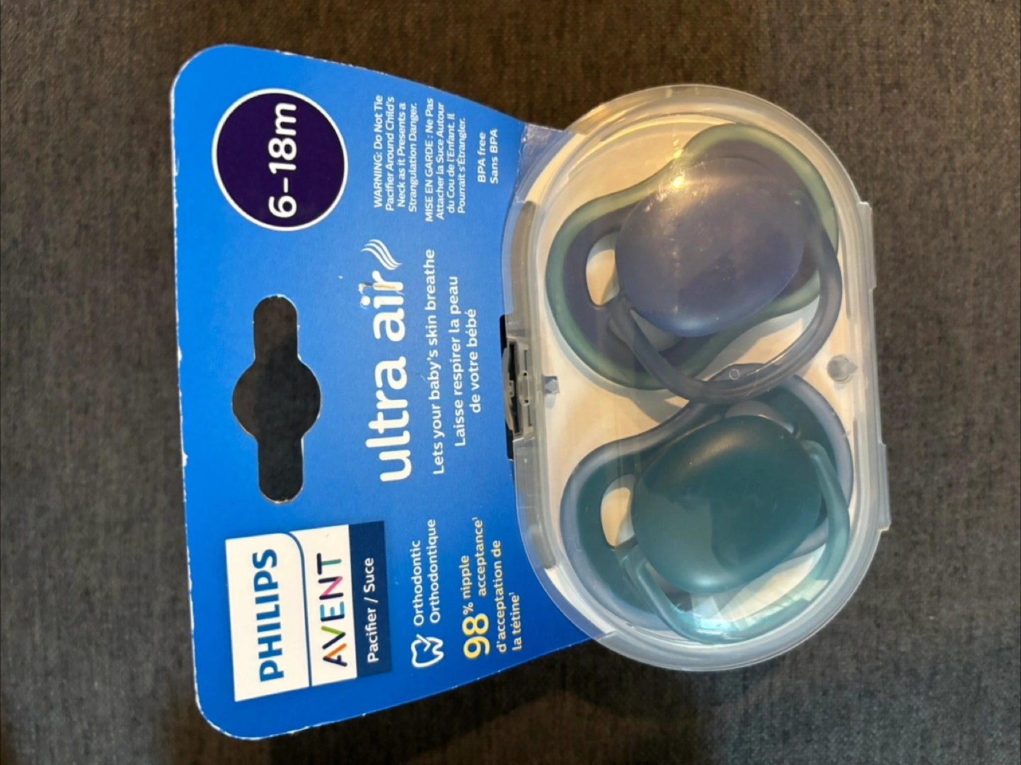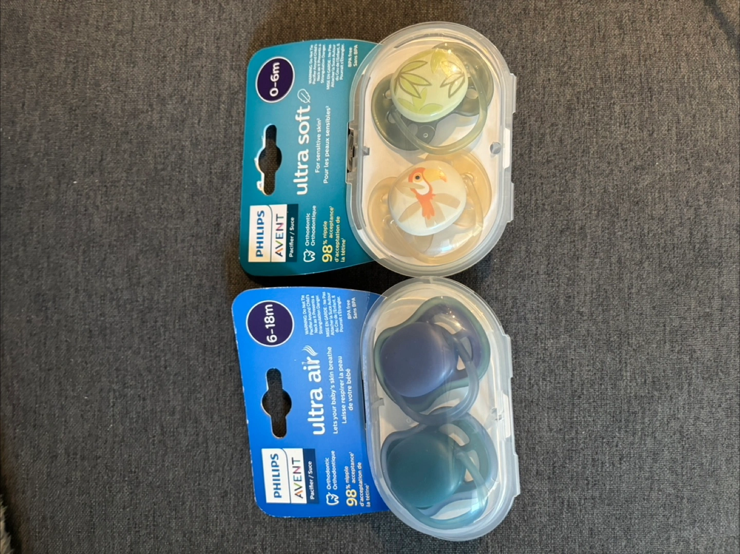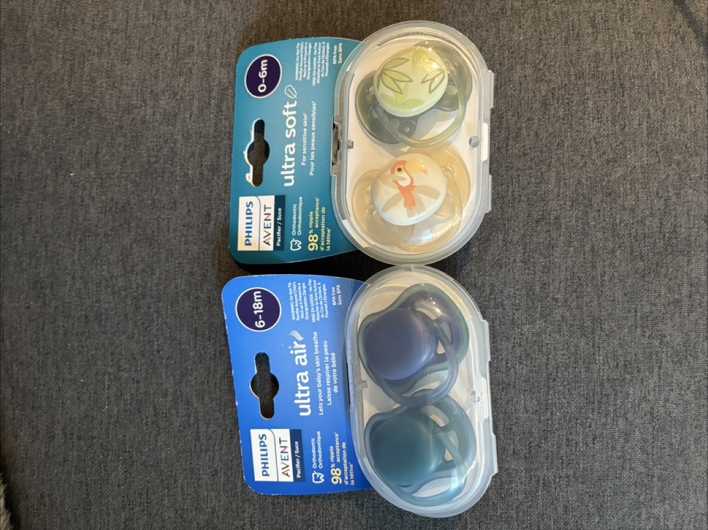 I have two sets of Philips Avent pacifiers available. One is Ultra Soft, suitable for ages 0-6 months, and the other is Ultra Air, designed for ages 6-18 months. They're both brand new in their original packaging!