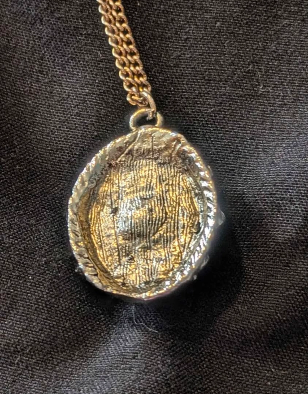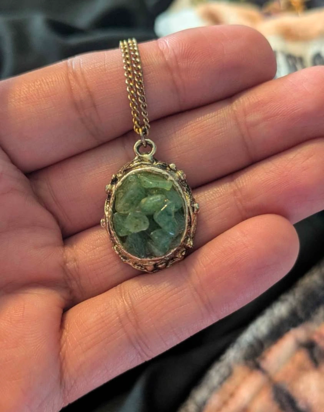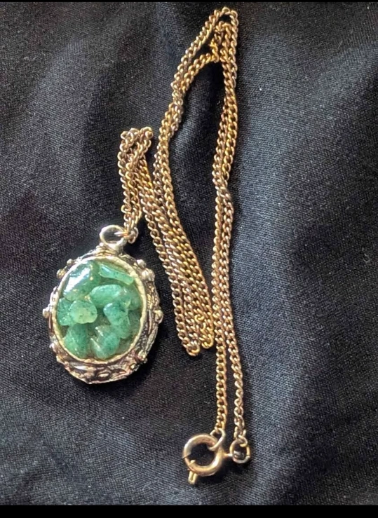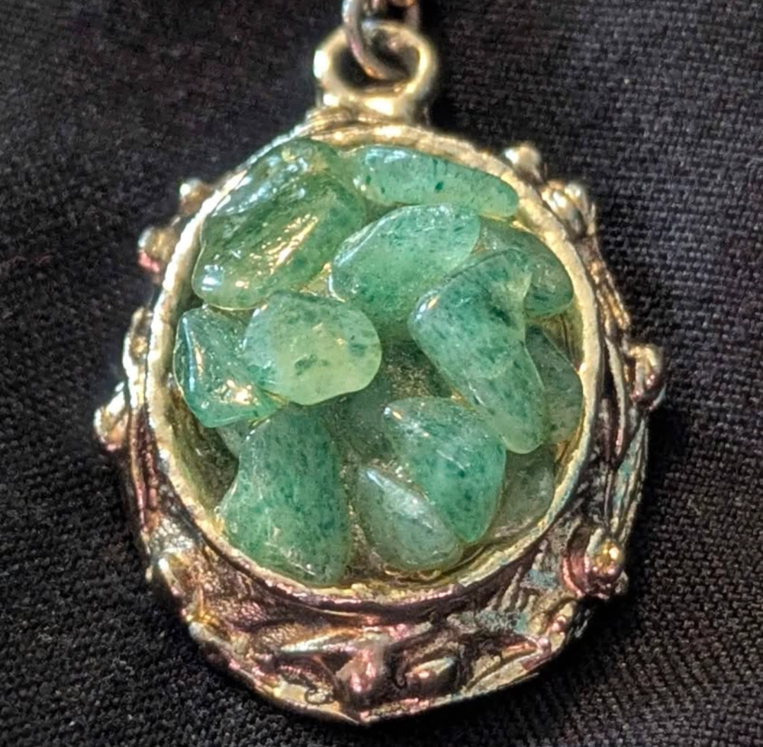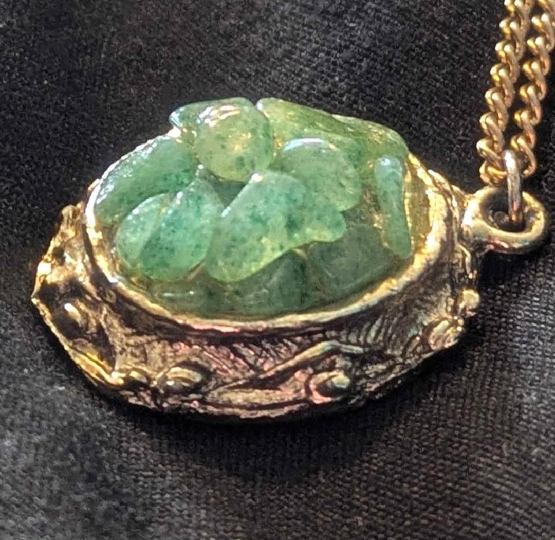 This is a lovely vintage pendant necklace featuring a collection of green aventurine stones set in an ornate gold-tone metal frame. The pendant hangs from a delicate gold chain, making it a unique and eye-catching piece of jewelry. Perfect for adding a touch of nature-inspired elegance to any outfit
