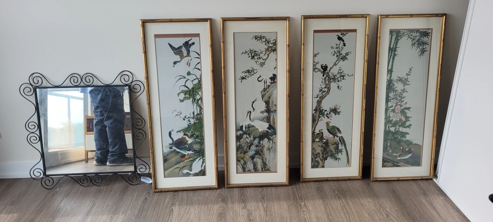 Selling a set of four framed Asian art prints. Each print features beautiful depictions of birds and nature scenes. They have a gold-coloured bamboo-style frame. Perfect for adding a touch of elegance to any room
