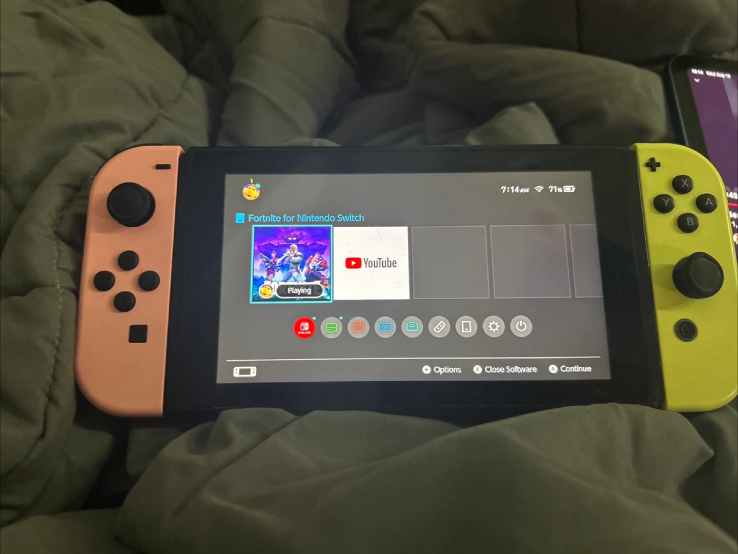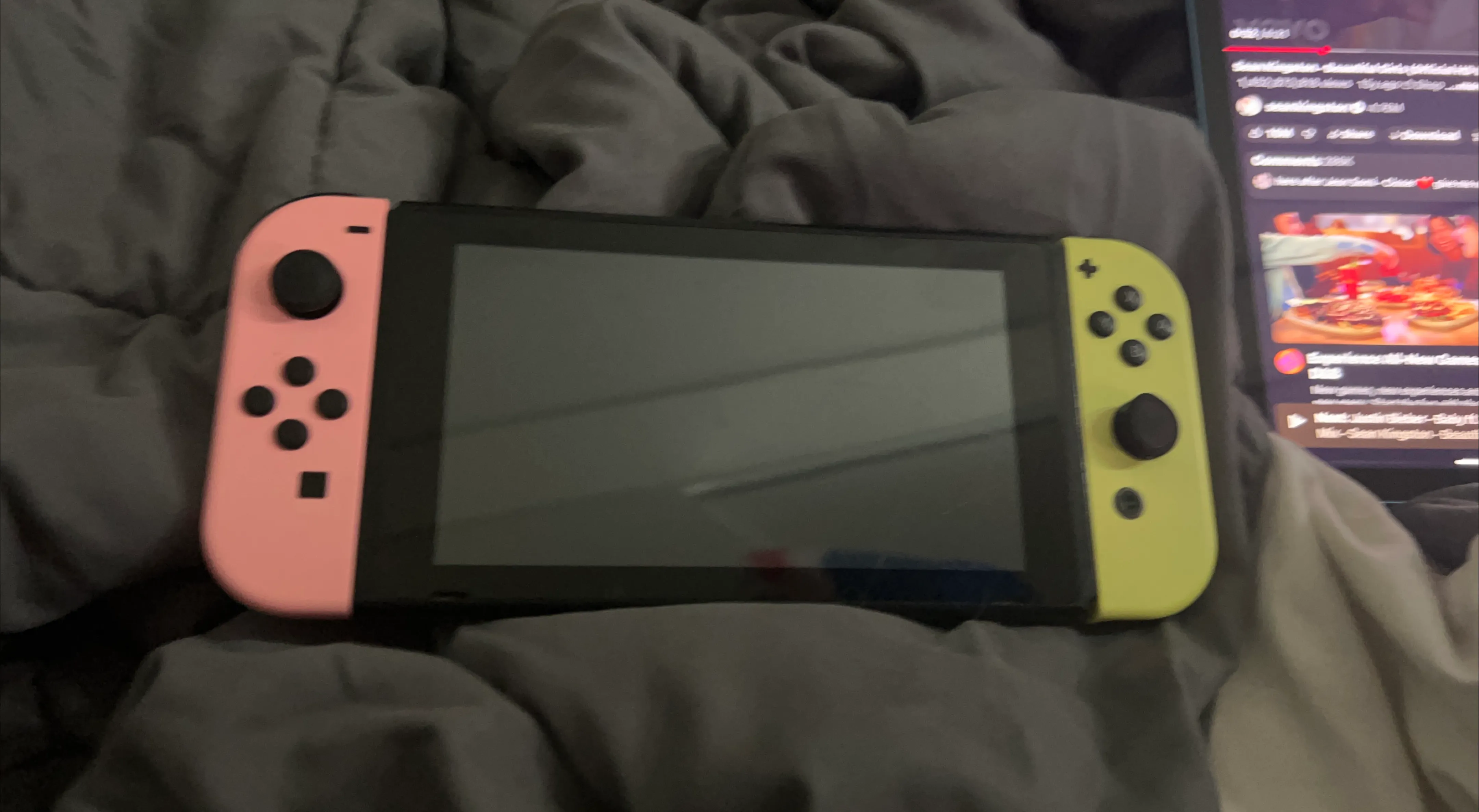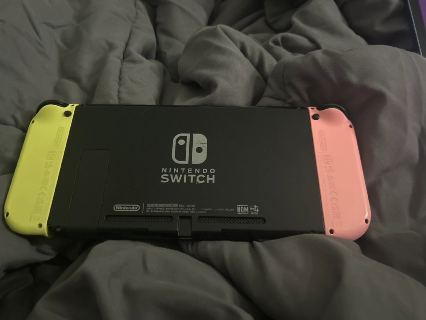 Selling a used Nintendo Switch console with a unique pink and green color combination! It's in good condition and ready for a new home.