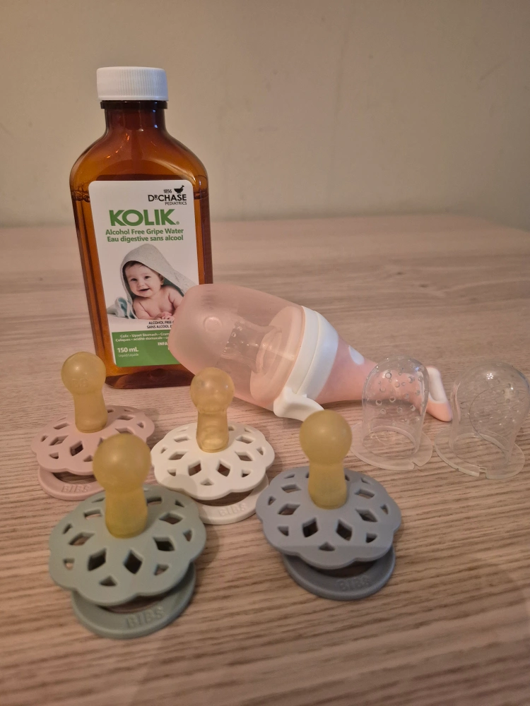 Selling a collection of BIBS pacifiers in various colours, along with a bottle of Dr. Chase Kolik Gripe Water (almost full). Perfect for soothing your little one! Also included is a introduction to solids feeding spoon, great for yogurt, puree or other soft foods. Spoon and pacifiers have never been used.
