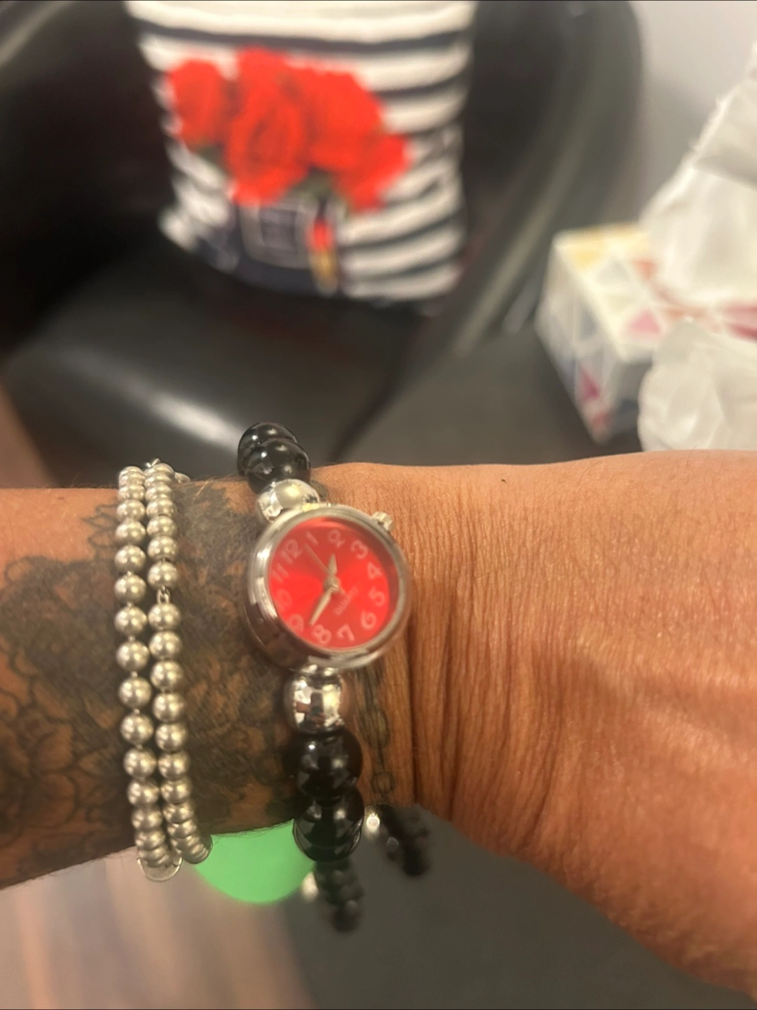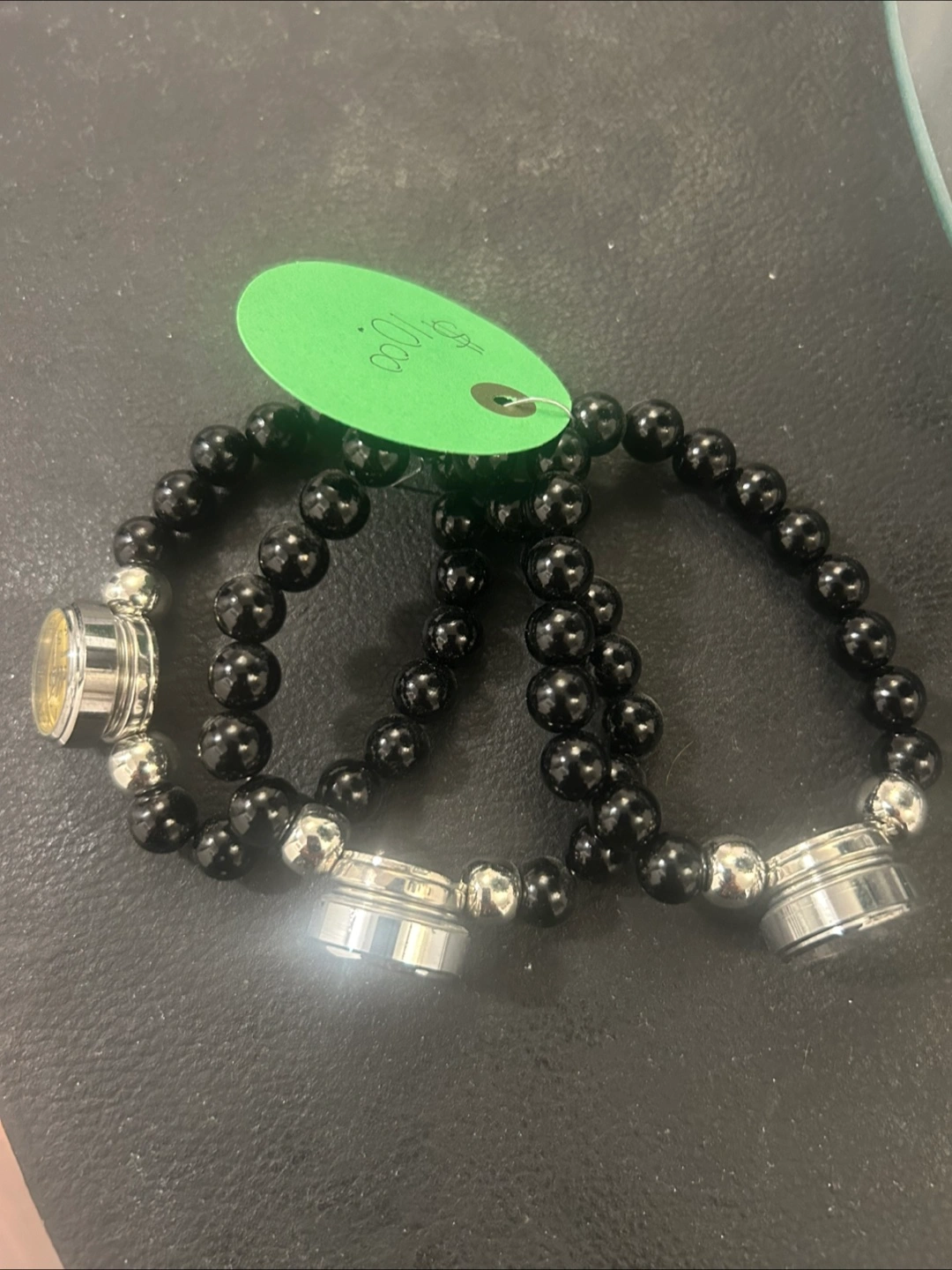 I'm selling a beaded bracelet watch. It features black and silver beads with a small watch face. It's a unique and stylish accessory! Different colors available