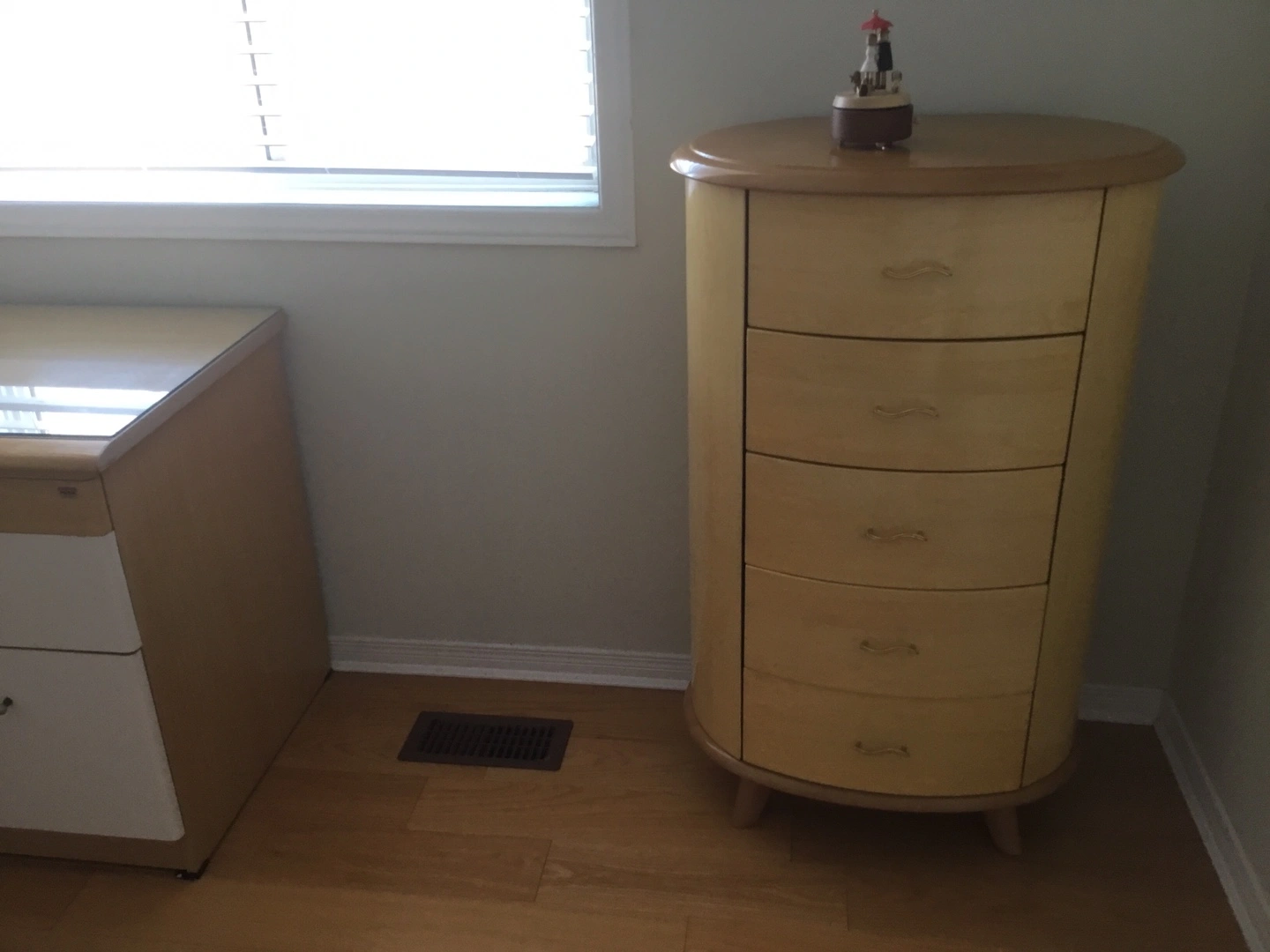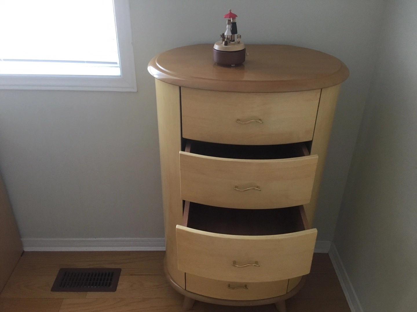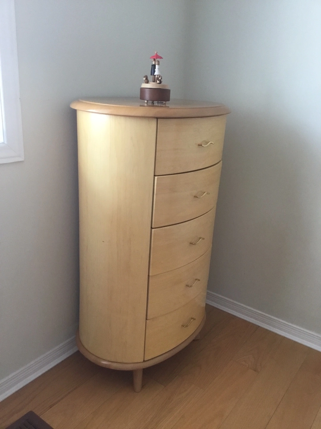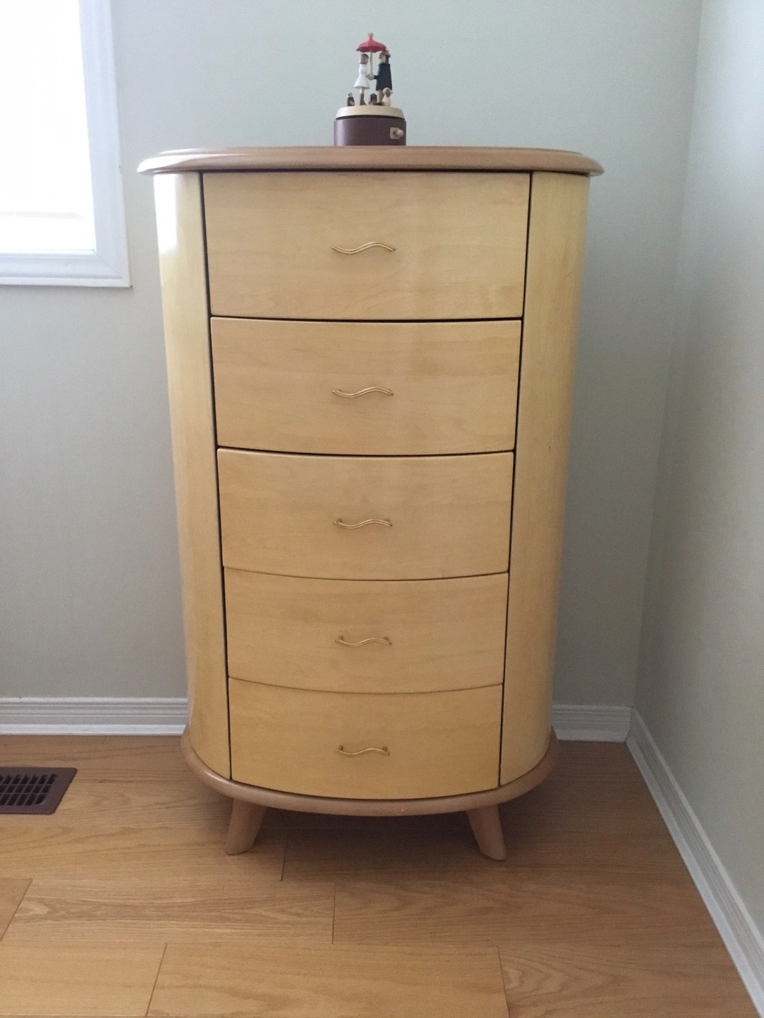 Here's a charming wooden dresser with a unique curved design! It features five drawers, providing ample storage space. It's a lovely piece to add a touch of elegance to any room in your home