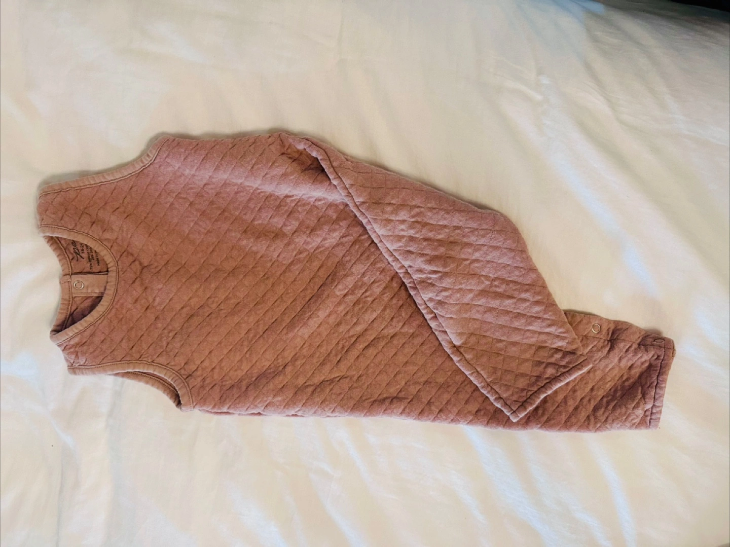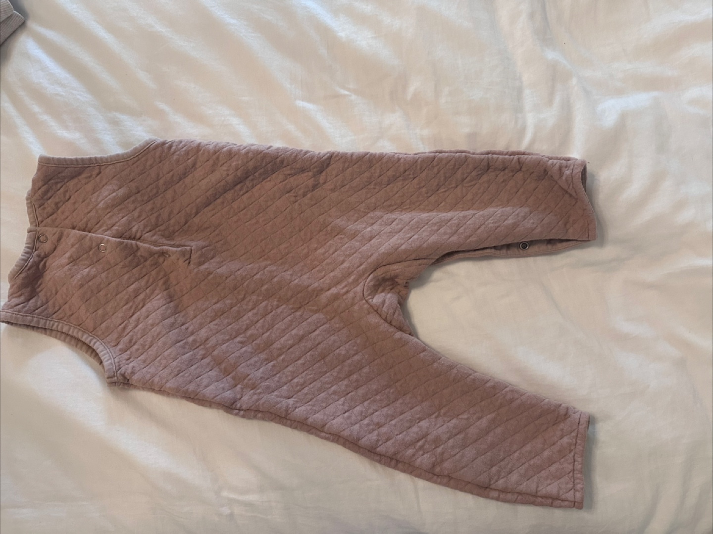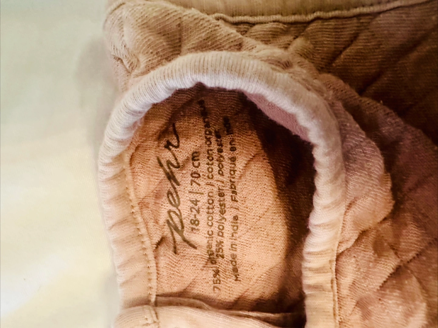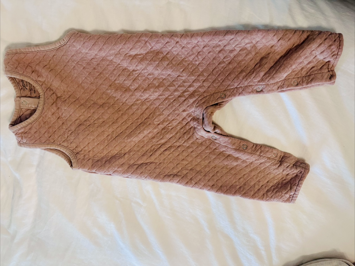 Selling a Pehr quilted romper, perfect for your little one! The size is 18-24 months (70cm). It's made of 75% organic cotton and 25% polyester. It has a sweet quilted pattern and would be great for layering or wearing on its own!