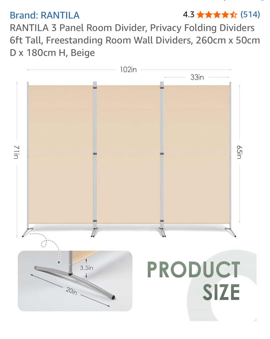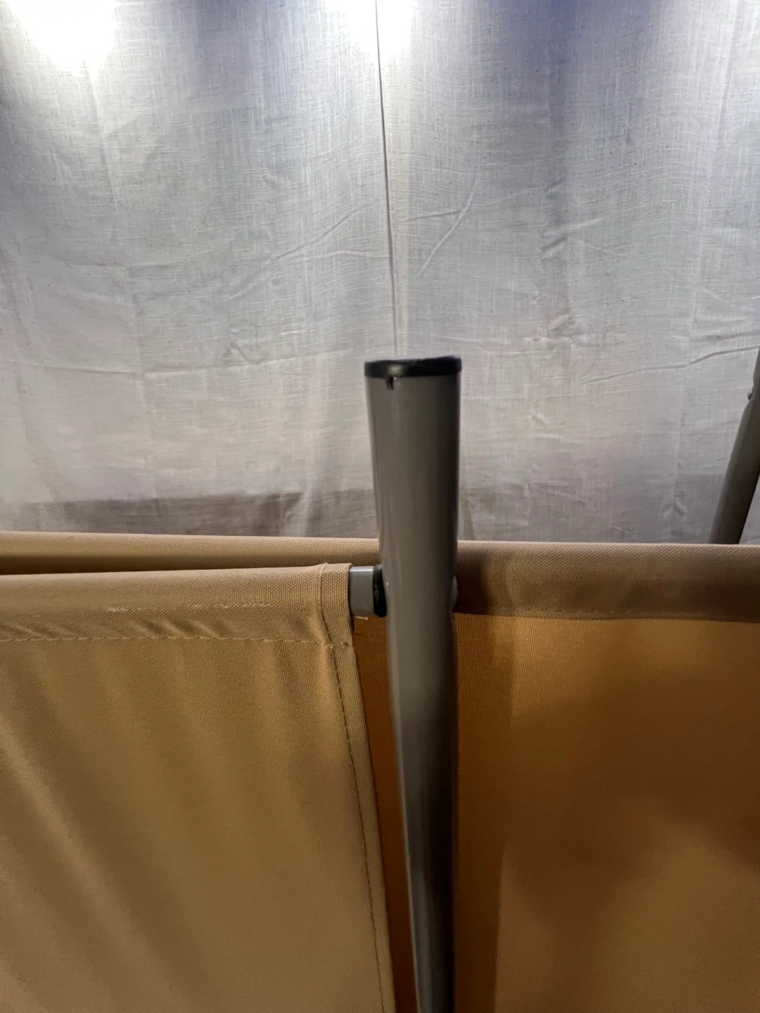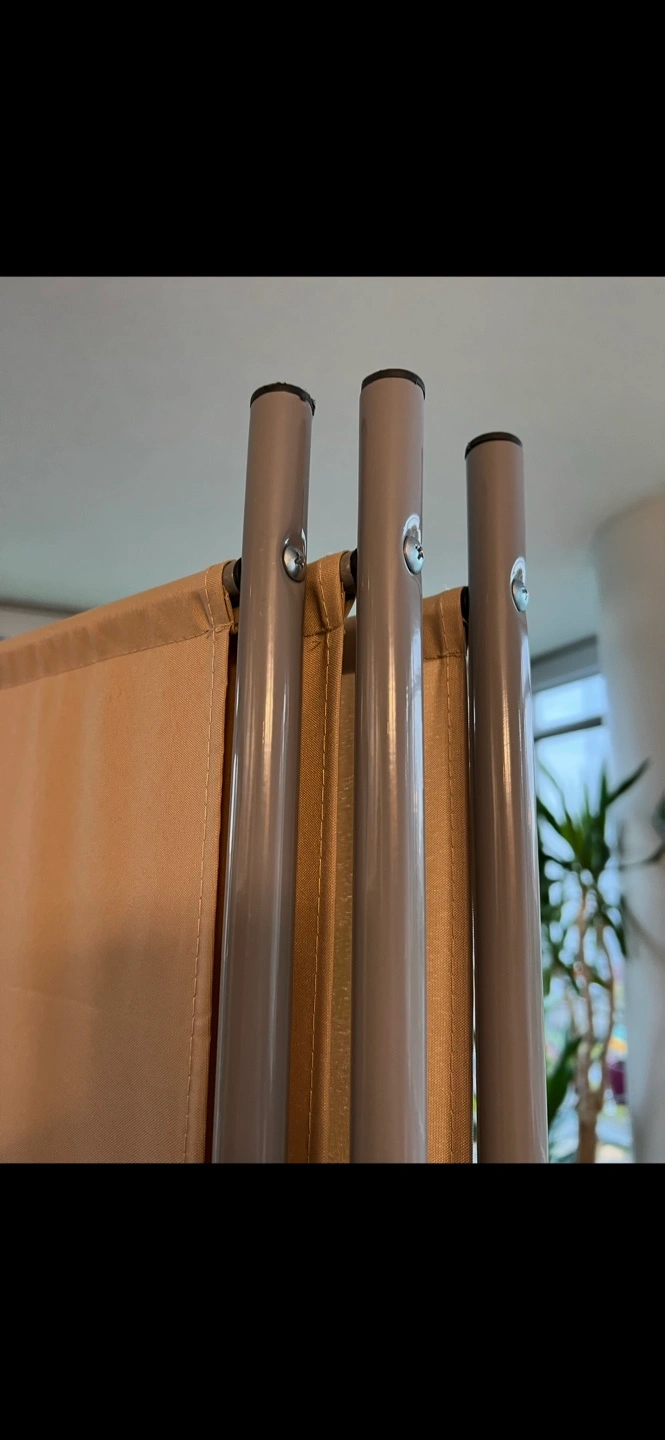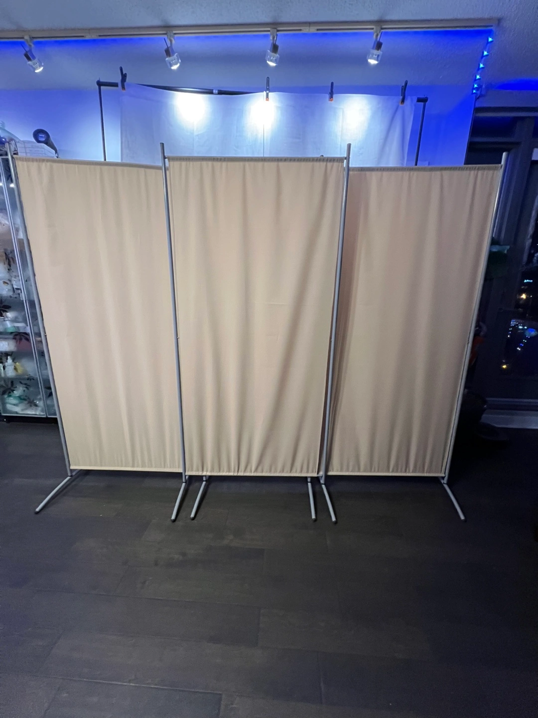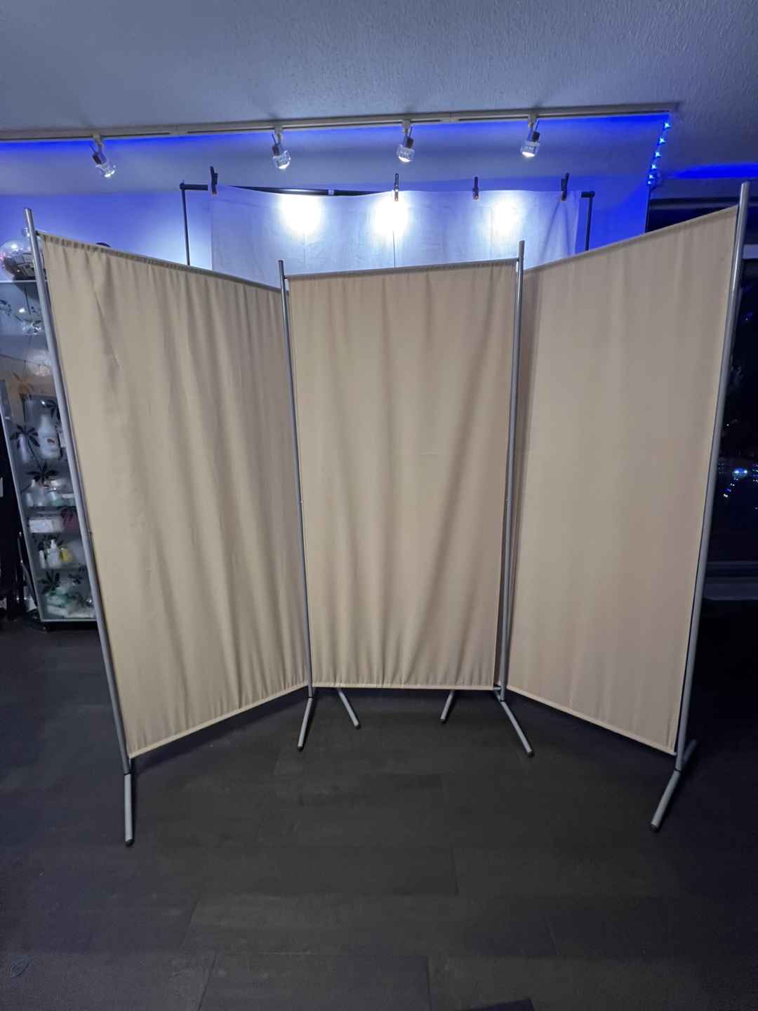 This Rantila 3 Panel Room Divider is great for creating privacy or dividing a space, standing 6ft tall with a beige finish. It's perfect for offices, bedrooms, living rooms, or even hospitals. It has dimensions of 260cm x 50cm x 180cm. This is a used item.