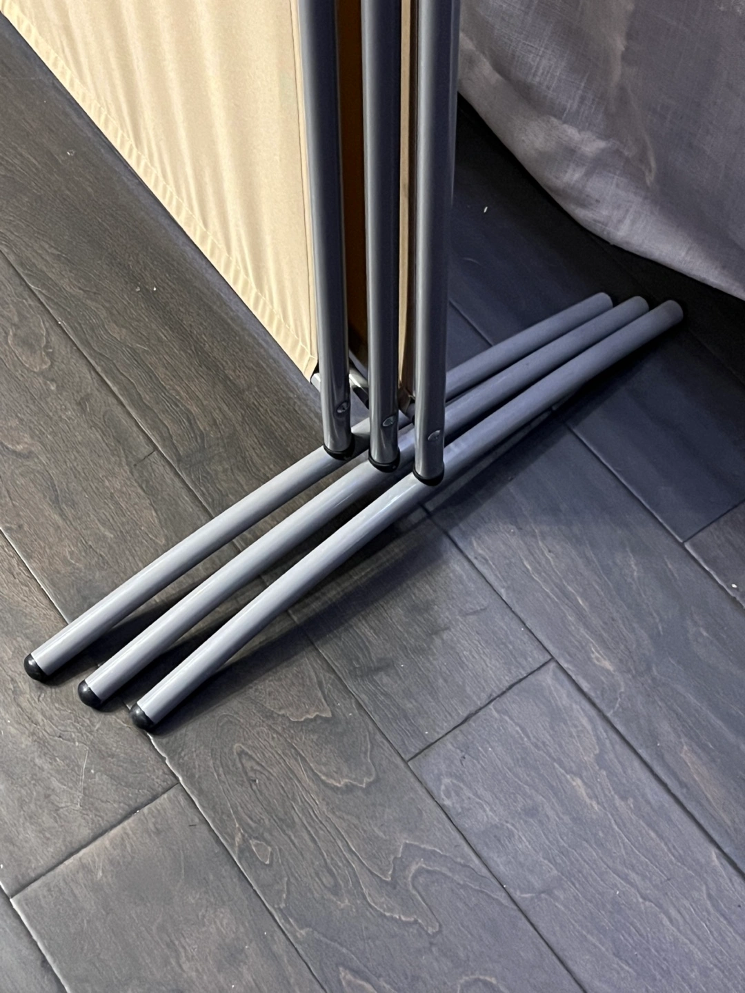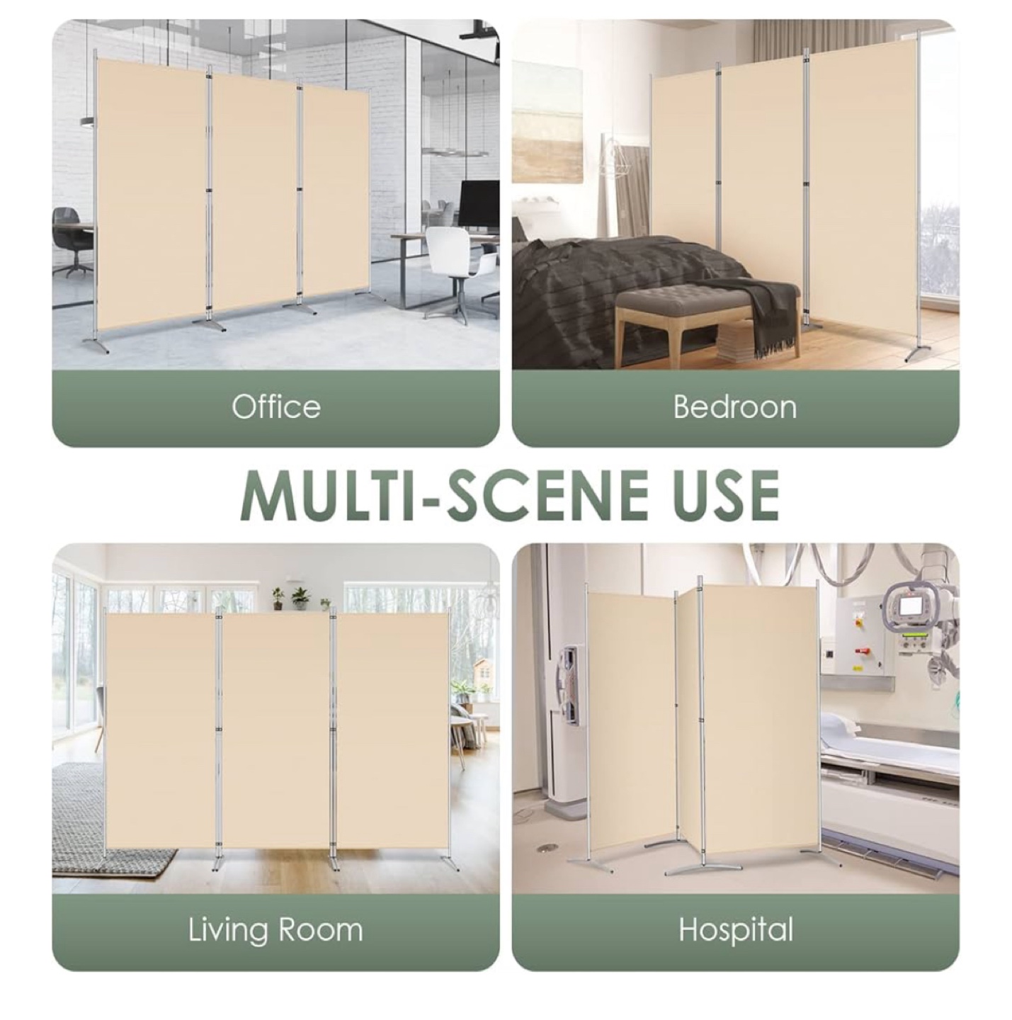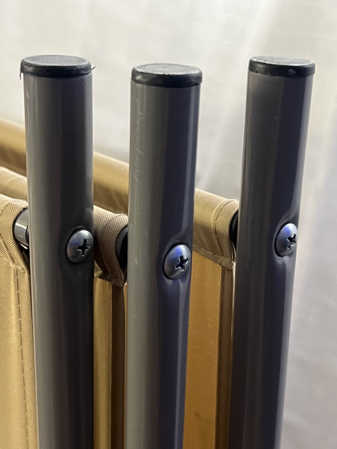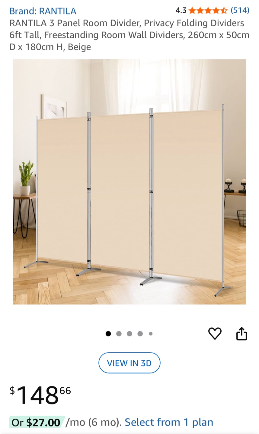 This Rantila 3 Panel Room Divider is great for creating privacy or dividing a space, standing 6ft tall with a beige finish. It's perfect for offices, bedrooms, living rooms, or even hospitals. It has dimensions of 260cm x 50cm x 180cm. This is a used item.