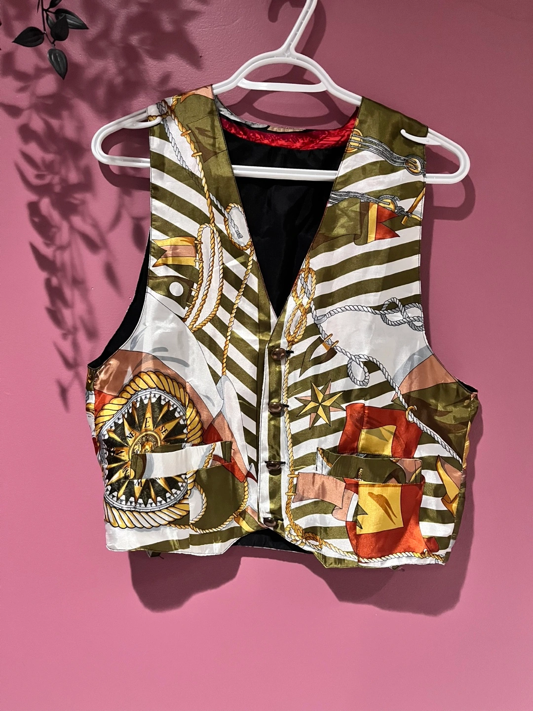 Unique patterned vest. No tags on it but fits like a medium, maybe even leaning towards large.