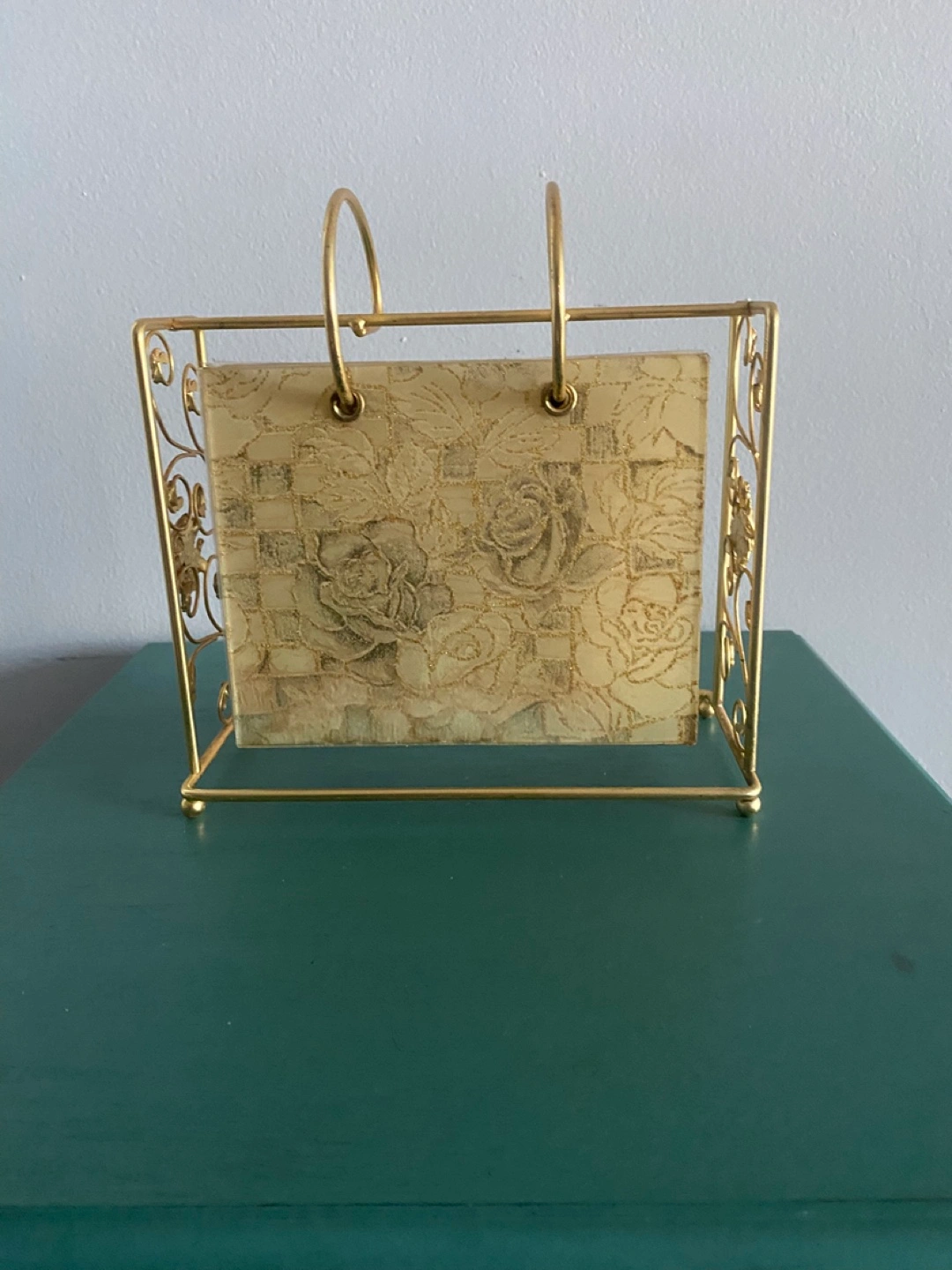 Here's a cute gold-tone metal photo holder! It has a floral design and can be used for holding 4x6 “ photos. It's in great condition and would look lovely on a desk or table