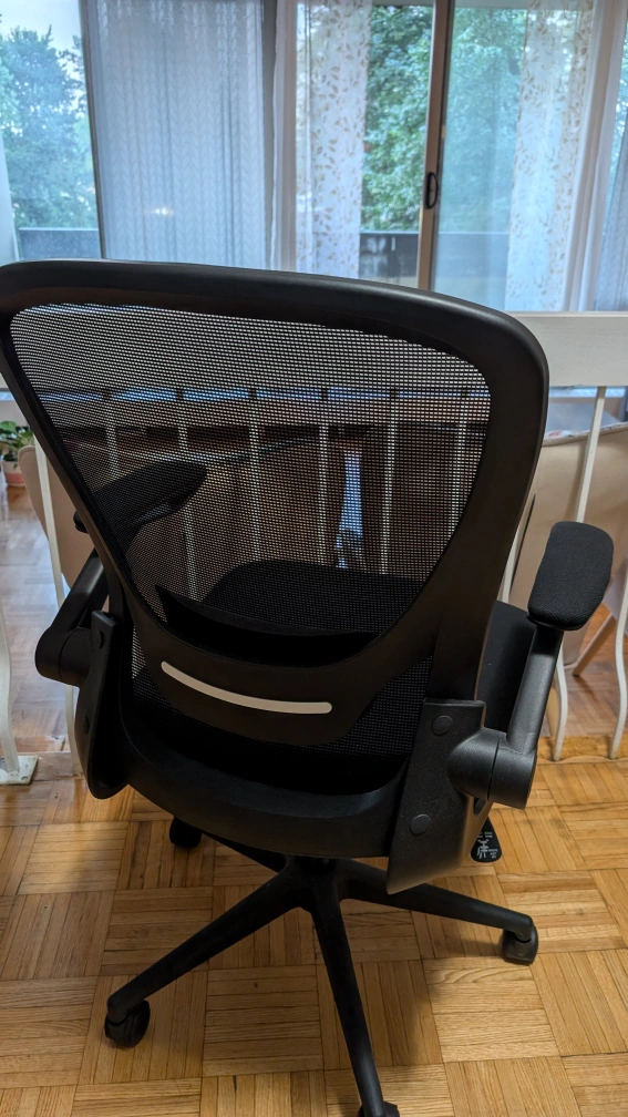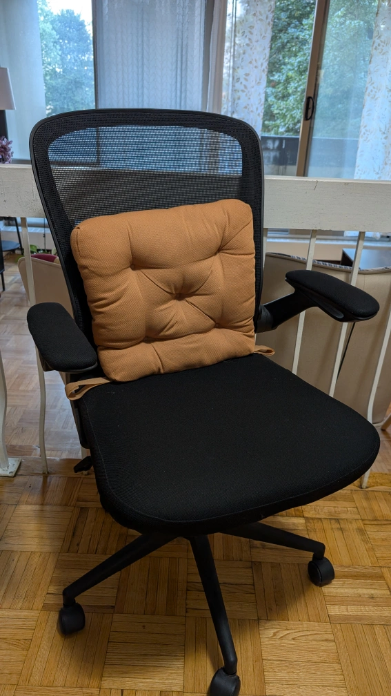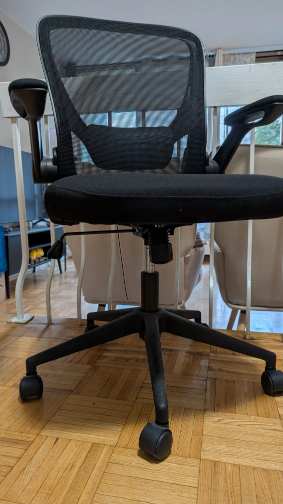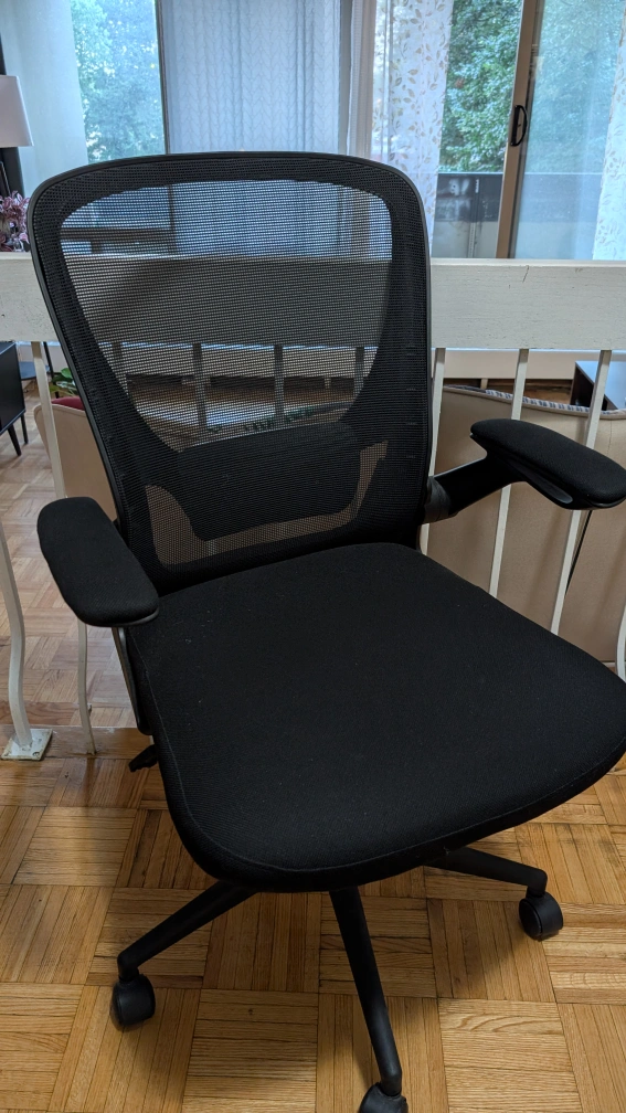 64Ergonomic Office Chair - Black In perfect working condition and looks like new. Selling because we don't have much use for it anymore. Features: Mesh Back Swivel Rolling Wheels Flip-Up Arms Lumbar Support It also comes with a seat cushion for extra comfort DM for details