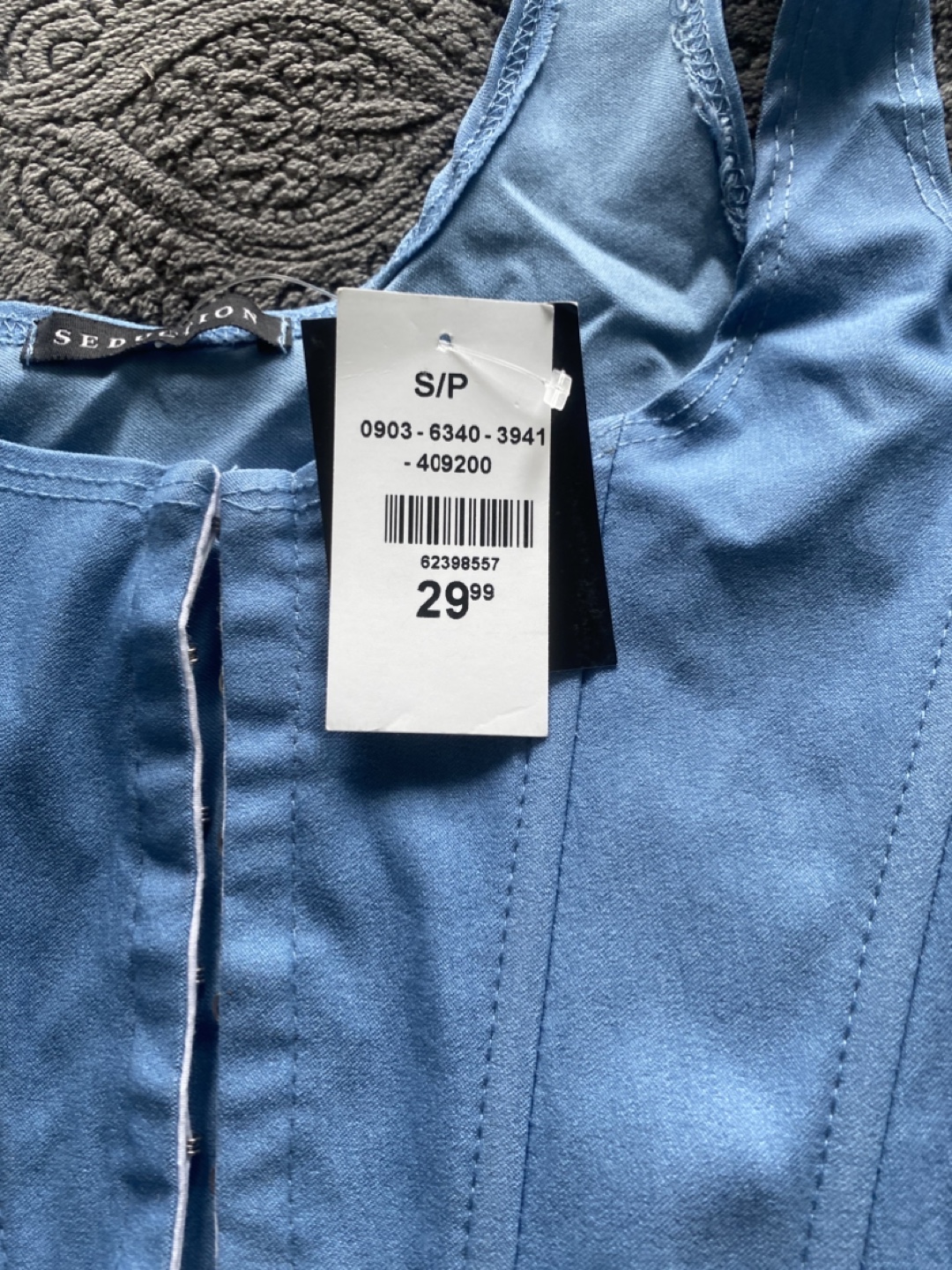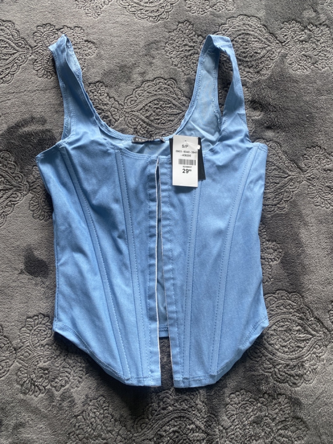 This is a super cute blue corset top, It's a size small (S/P) and made of 65% Rayon, 30% Nylon, and 5% Spandex. Originally bought for $29.99!