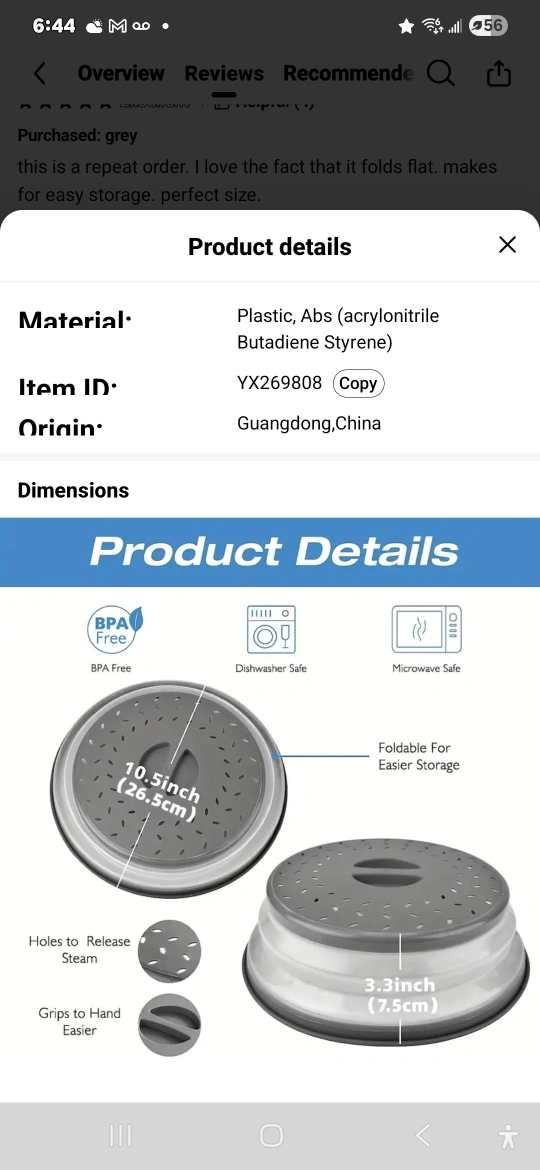 I'm selling a collapsible splatter screen! It's made of Plastic, Abs (acrylonitrile Butadiene Styrene). It's foldable for easier storage and is BPA, dishwasher, and microwave safe. It measures 10.5 inches (26.5cm).