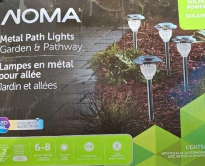 I'm selling a set of NOMA metal path lights, perfect for your garden or pathway. They are solar powered, so no need to worry about wiring! The lights have a cool white LED and come with ten AA Ni-Cd rechargeable batteries. They'll add a lovely touch to your outdoor space