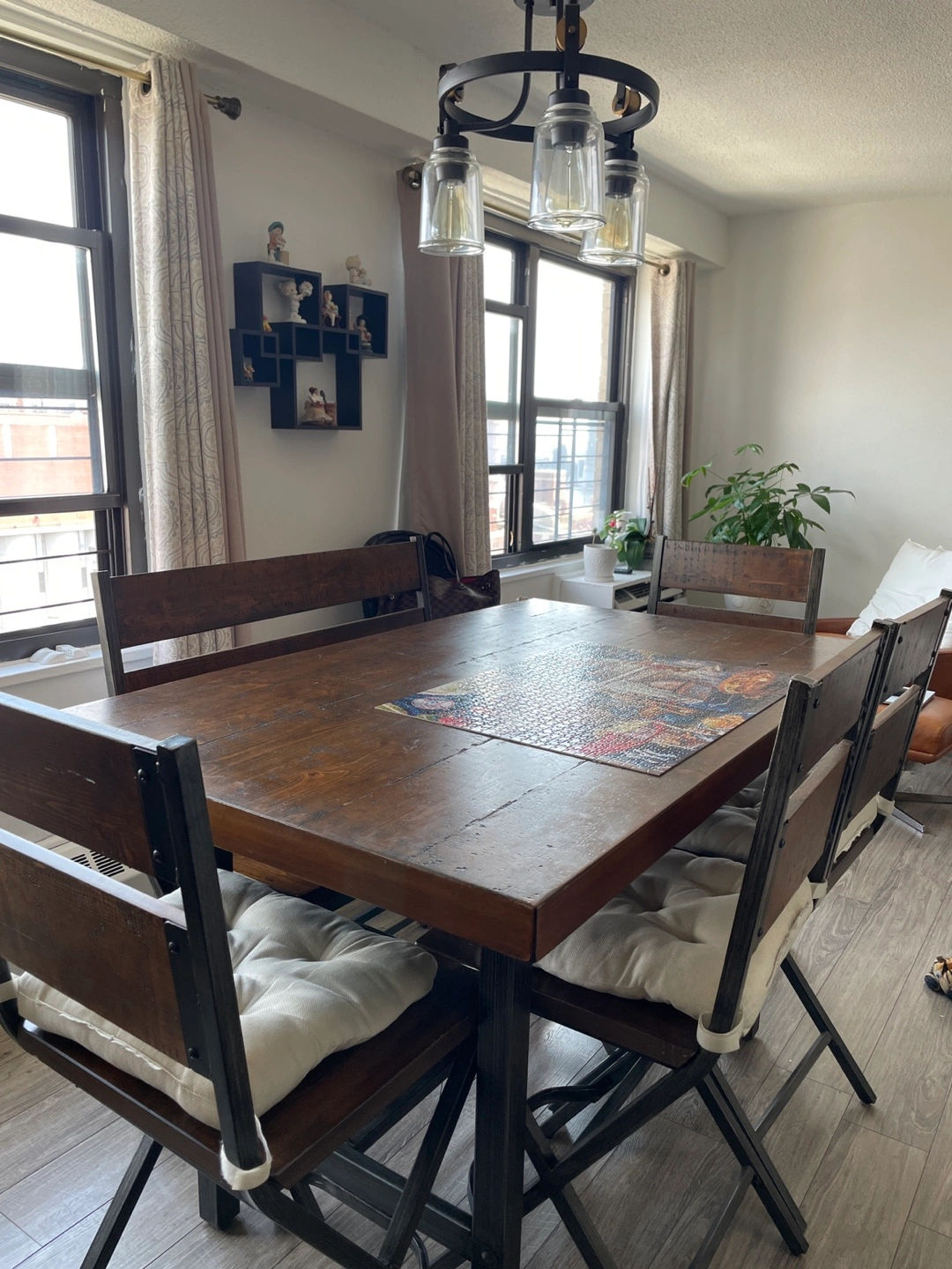 Selling a wooden dining table with 4 chairs and bench with back rest. The table has a rustic look with a dark wood finish and a metal base. The chairs have a matching wood and metal frame.