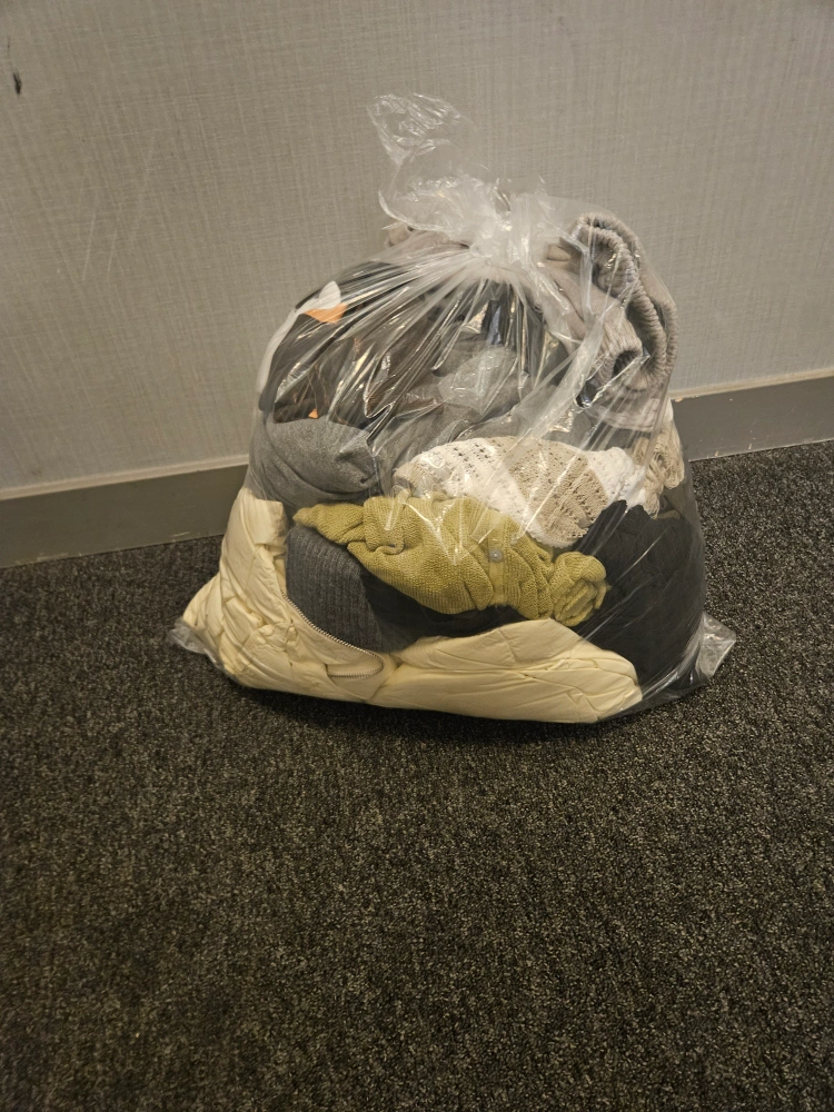 I have a bag of mixed clothing items for sale. There's a variety of styles and materials in the bag. Perfect for someone looking to add some pieces to their wardrobe!