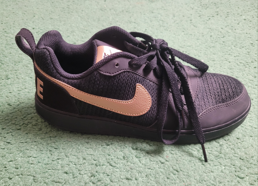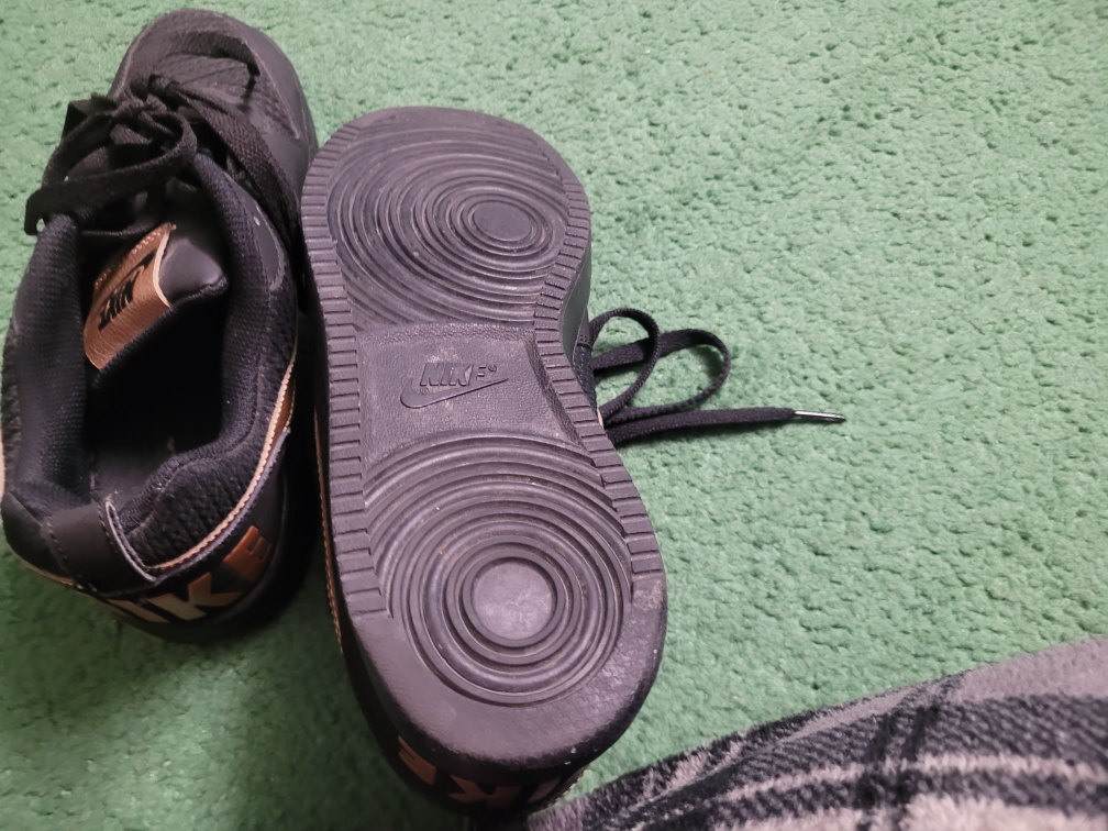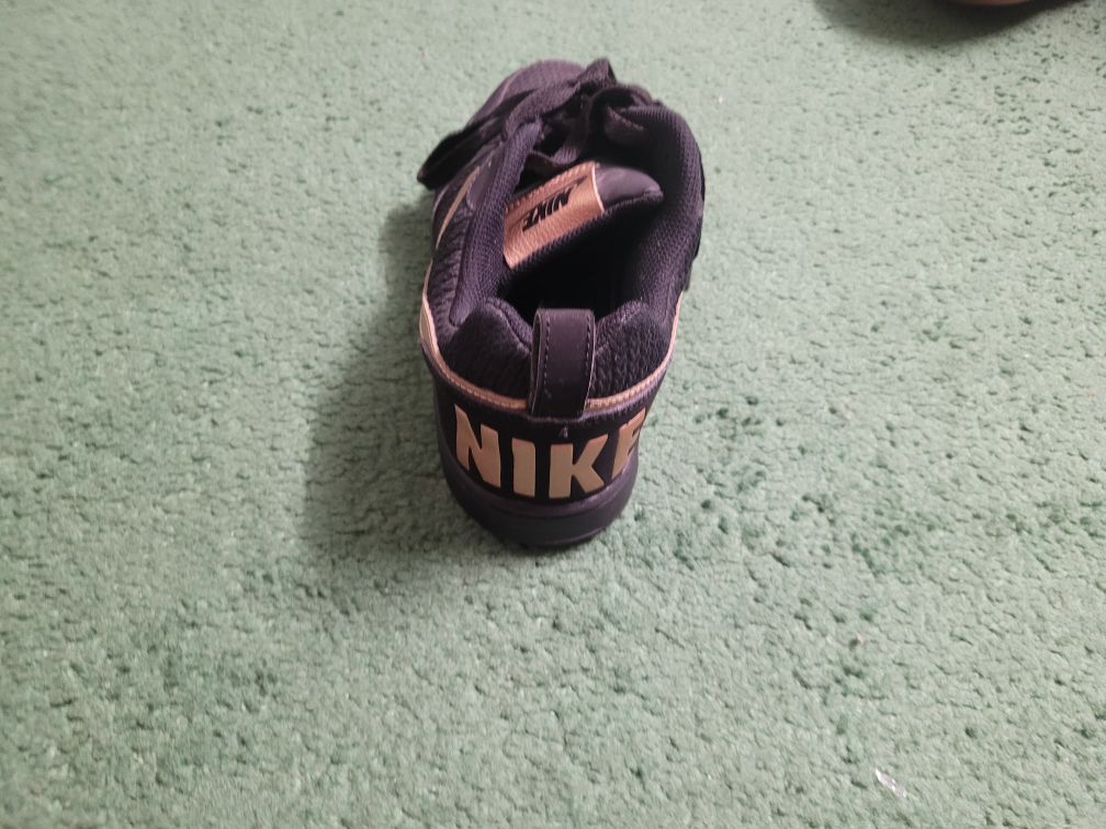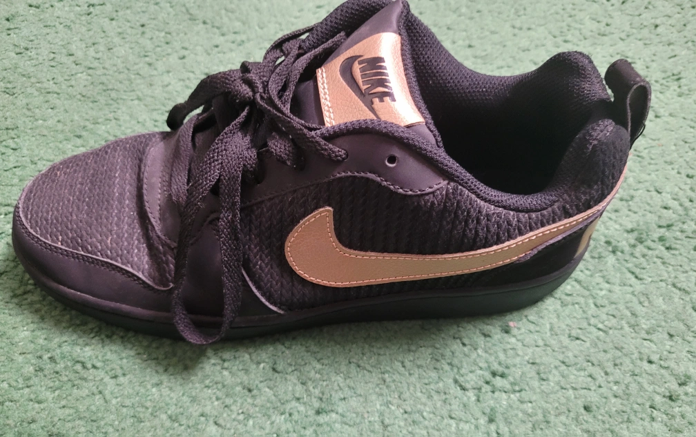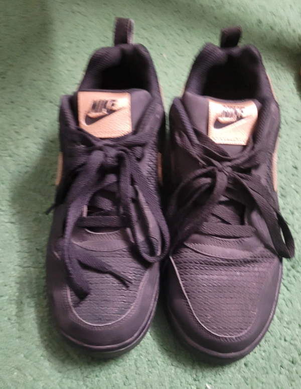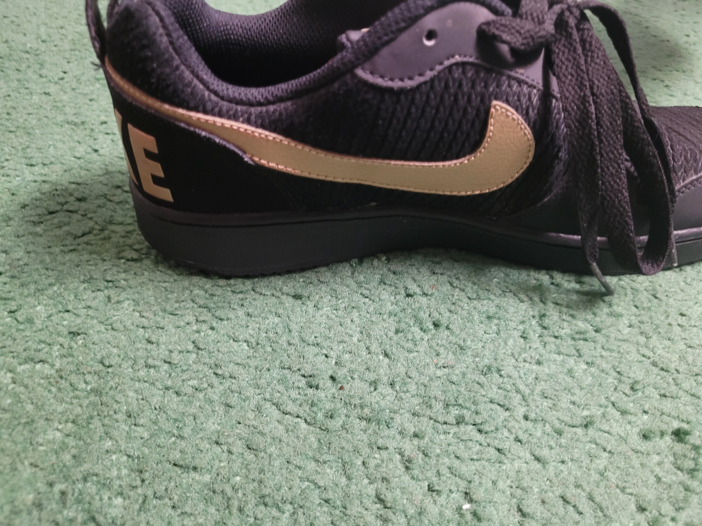 These are a pair of Nike Court Borough Low 2 basketball shoes in black with gold features. They feature the Nike logo on the side and back. size 9. worn few times