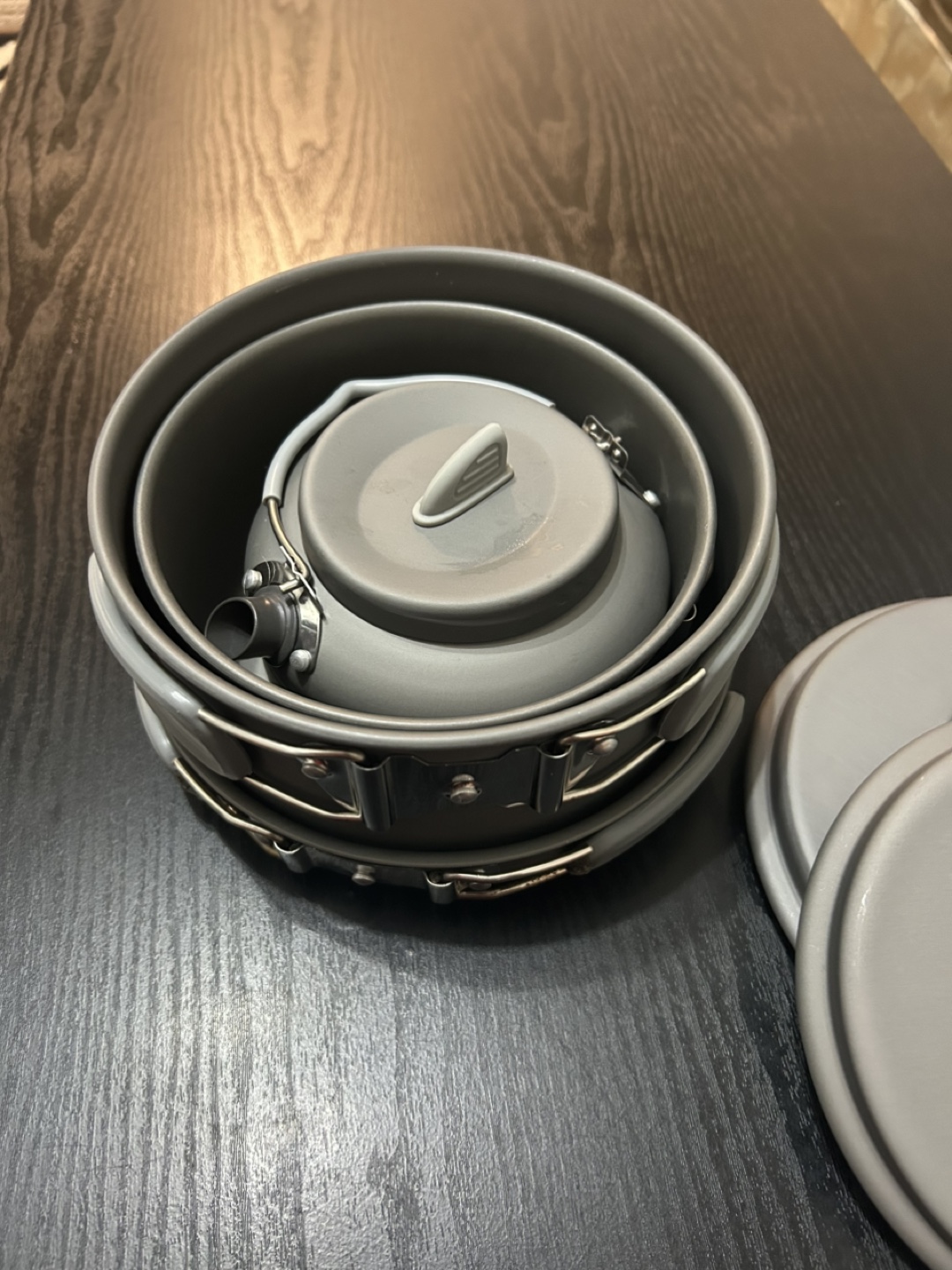 Selling a Woods titanium camping cookware set. It looks like it's in excellent condition and ready for your next outdoor adventure! Includes multiple pots, pans, and a kettle, all neatly packed in a mesh bag for easy transport. Perfect for cooking up meals while camping or hiking. OBO