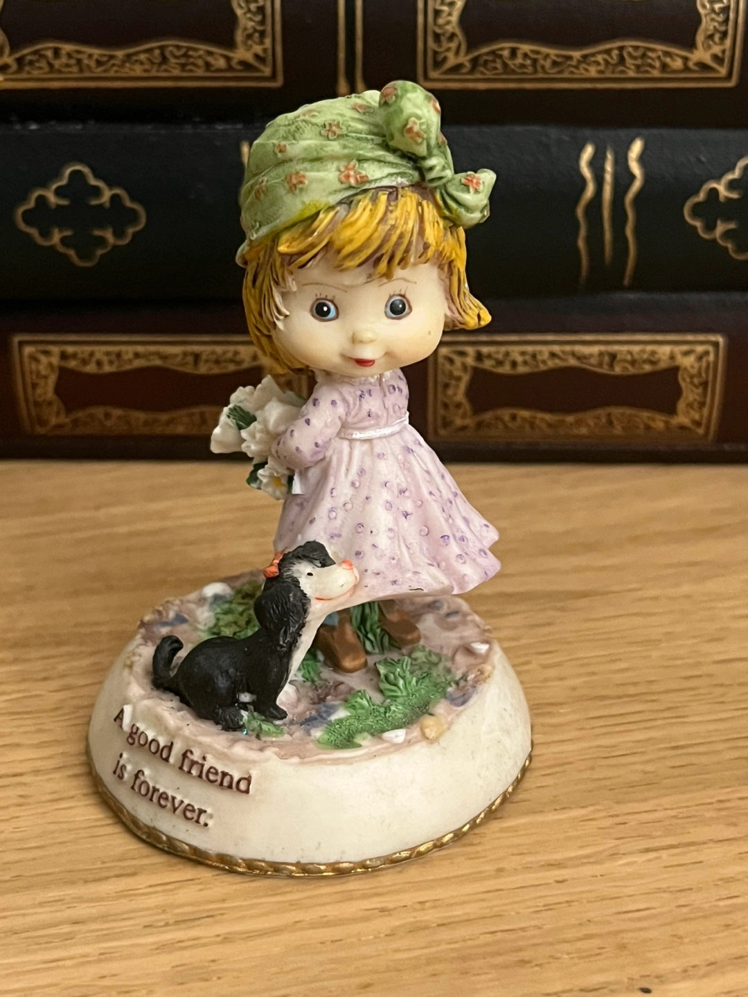 This charming figurine features a girl holding flowers with a cute dog by her side. The base reads "A good friend is forever" making it a sweet addition to any collection or a thoughtful gift for a friend