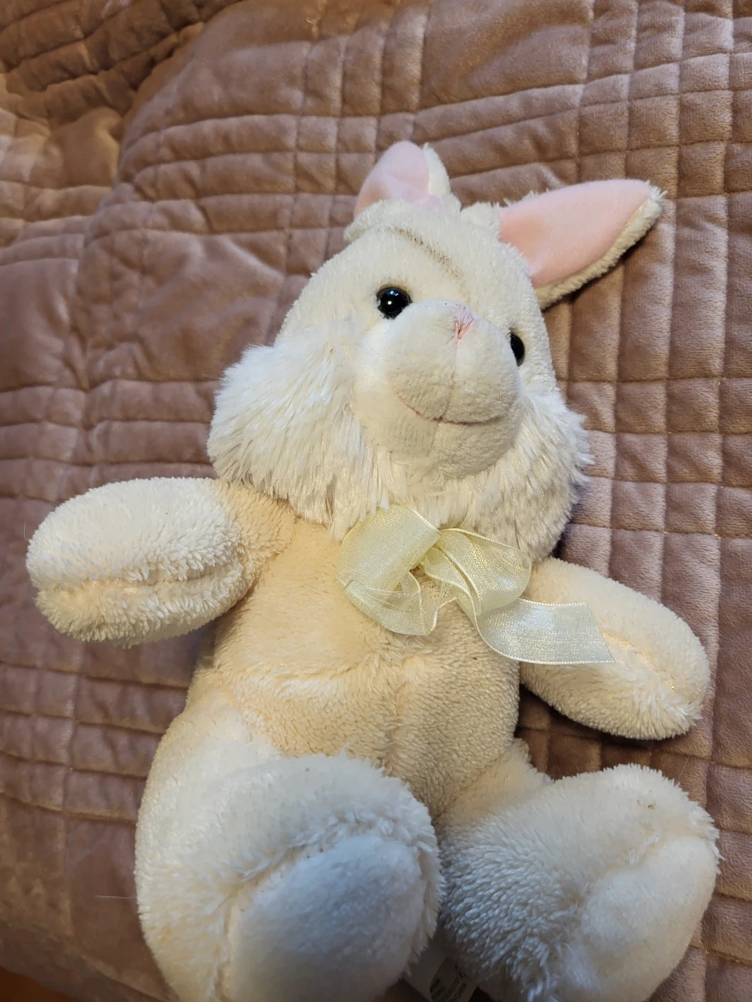 This is a soft, plush bunny rabbit stuffed animal. It's white with pink accents on its ears and a sheer yellow ribbon tied in a bow. Its fur is fluffy and comforting to the touch
