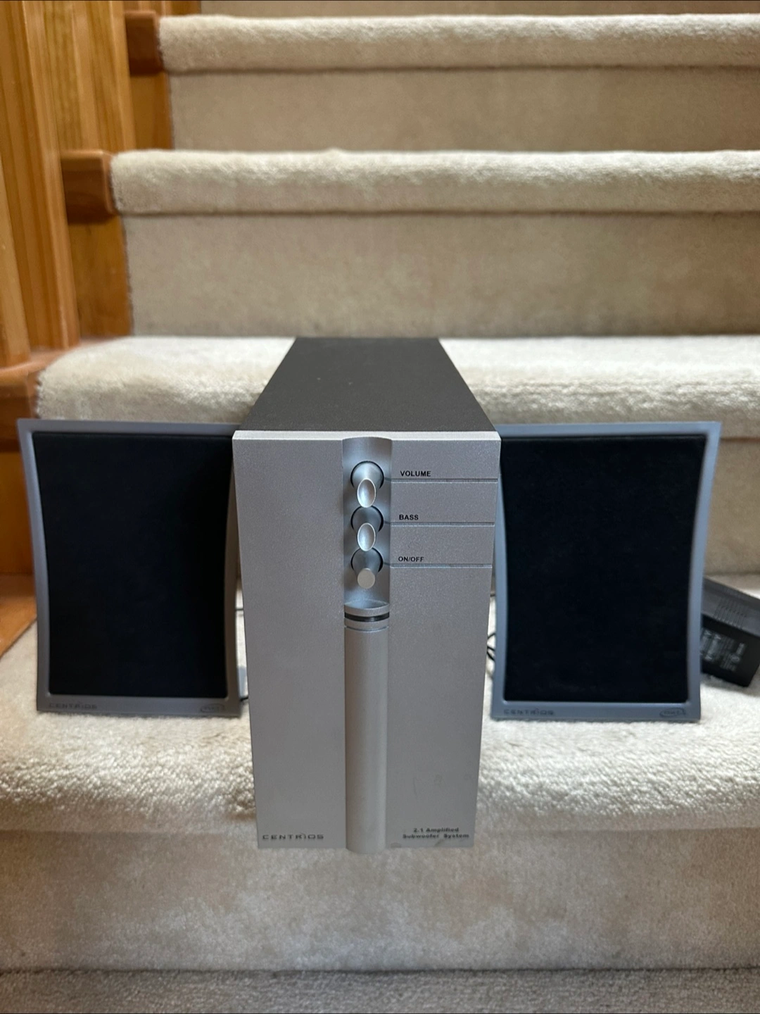 Selling a Centrios 2.1 Amplified Subwoofer System. It includes volume and bass controls, and an on/off switch. Perfect for enhancing your audio experience!