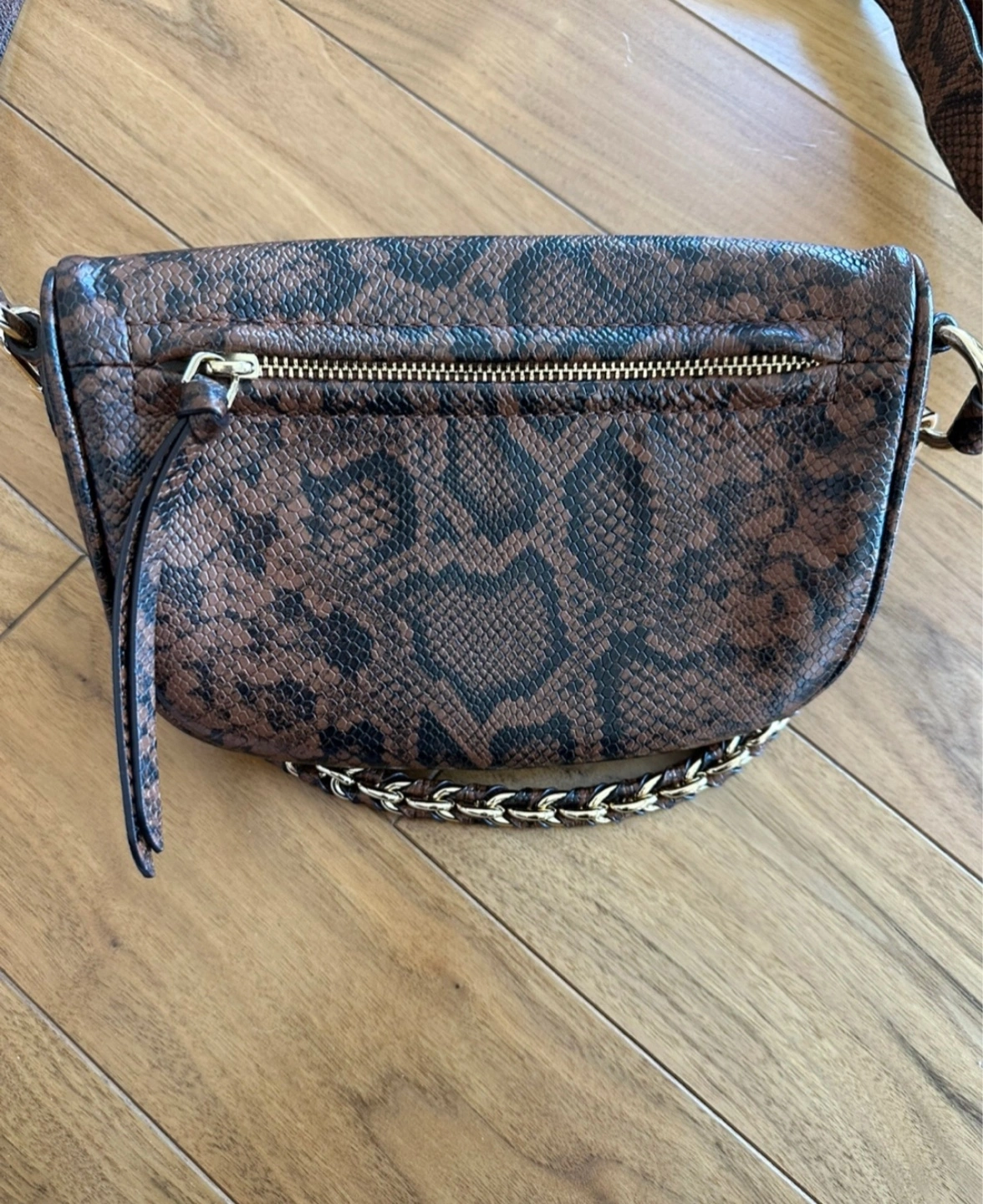30This stylish Michael Kors belt bag features a unique snakeskin pattern and gold chain detailing. It's perfect for adding a touch of flair to any outfit! The bag is in great condition and ready for a new home.