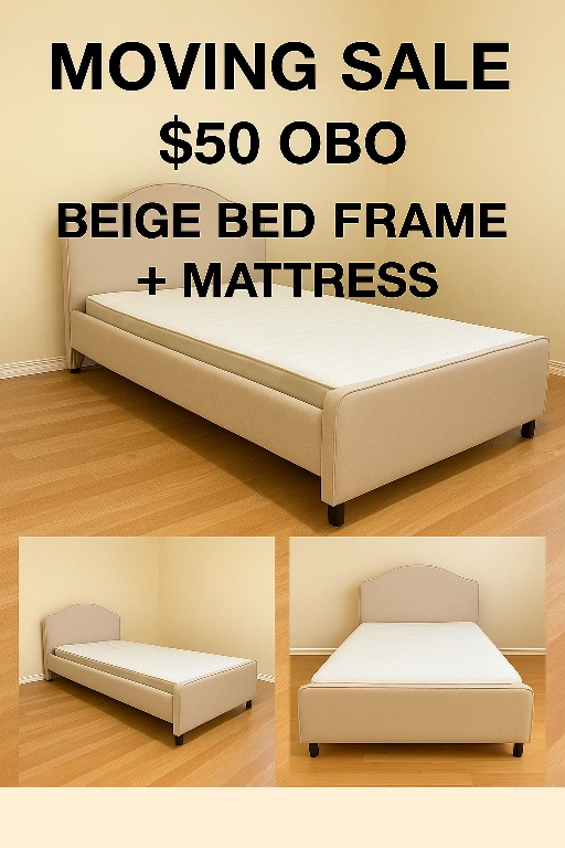Selling a beige bed frame with a mattress. It's in good condition and ready for a new home. Perfect for a small bedroom or guest roomIkea Twin Bed Frame + HUSVIKA Mattress – $50 (Moving Sale)